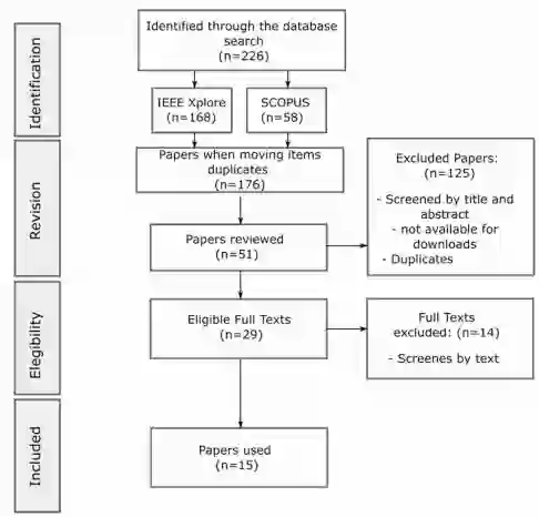 本文进行的系统性综述,在初步检索中考虑了IEEE Xplore(168篇)和SCOPUS(58篇)科学数据库中的226篇文章,使用的搜索关键词是:军事通信、通信协议、信息传输、技术。删除了两个数据库中重复的50篇文档,随后在176篇文档中,根据标题和摘要排除了125篇。在考虑的51篇文章中,排除了14篇,最终得到15篇严格涉及与本研究工作相关主题的文章,该过程如图6所示。