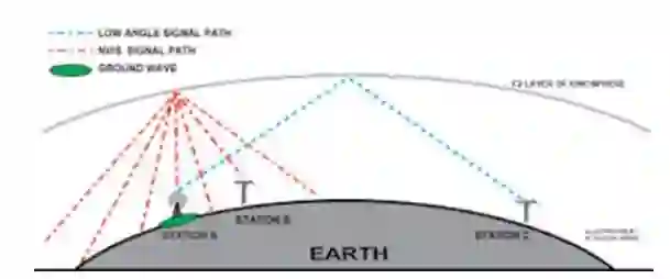 这种通信方式的工作原理是发射高频(HF)频谱(0.5至10兆赫)的波,信号以相对于水平方向大于80°的角度发送,并根据一天中的时间和电离层折射的变化,利用其折射提供数百公里的覆盖范围。图5说明了当以大于80°的角度(NVIS)发送时电磁波在电离层中的反射效应,以及以较小角度发送时的情况,后者可以实现更长距离的传输,但对于NVIS使用的频率,其保真度较低。