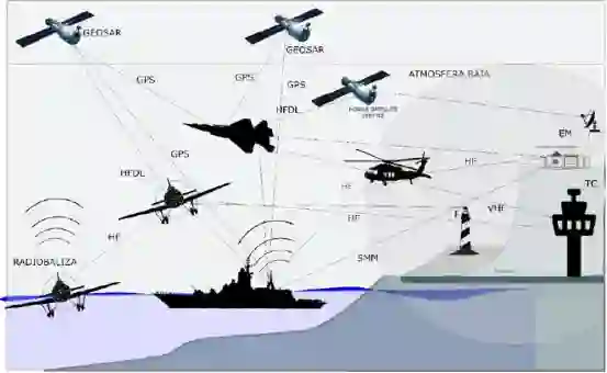 武装部队的通信,无论是专门用于海上还是空中领域,都具有相似的技术和操作特性,这取决于它们与其他飞机或舰船以及固定通信站的距离。图3展示了用于航空和海上领域的技术概览,由一组卫星支持,这些卫星通过使用全球定位系统(GPS)进行三角定位,获取并传输位置信息。