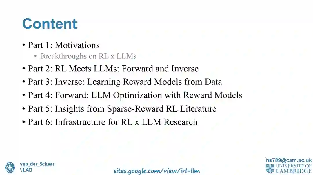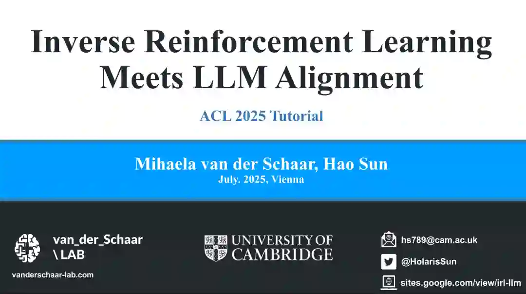 大语言模型(LLM)的对齐问题仍是强化学习领域中最关键的挑战之一。正如 DeepSeek-R1 等模型的成功所展示的那样,提升对齐效果不仅依赖于更优的模型架构,还需对强化学习(RL)和奖励建模有更深入的理解。本教程将探讨逆向强化学习(Inverse Reinforcement Learning, IRL)与大语言模型对齐之间的关联,为研究人员和实践者提供一条结构化的研究路径。 我们将 LLM 对齐建模为一个逆强化学习问题,对比传统强化学习与从人类数据中推断奖励的逆向方法。教程重点聚焦于奖励模型,探讨其如何从不同类型的数据中构建,包括数学推理、二元反馈、偏好数据以及示范行为等。 在理论之外,我们还将探讨基础设施与实践实现,展示如何在几分钟内高效评估基于 IRL 的 LLM 对齐思路。最后,教程将结合稀疏奖励强化学习的相关经验,介绍奖励塑形(reward shaping)、责任归因(credit assignment)以及自对弈(self-play)中获得的启示。 通过本教程,参与者将从理论和实践两个维度深入理解基于 IRL 的大语言模型对齐方法,并掌握高效构建更好对齐模型的核心工具。