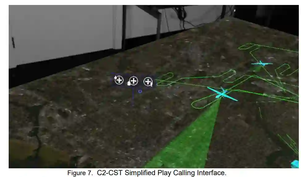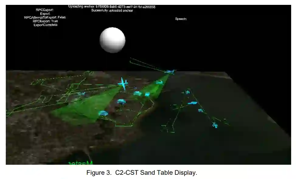 C2-CST 项目概念通过增强现实设备平台与 IMPACT 系统连接和互动。IMPACT 系统是一个研究原型,展示了人类对多个自主无人驾驶车辆的监督控制,因此是开发和测试高级用户界面的理想 C2 系统终端目标。其目标是允许人与人之间、人与机器之间进行协作,以便对模拟的多无人异构自主飞行器进行态势感知、决策以及 C2 规划和执行。先进的用户界面允许多名操作员通过共享的全息沙盘(用于军事规划和战争游戏的地形模型)进行协作,同时控制多辆无人驾驶车辆。我们利用多个网络框架来卸载车辆自主性和规划算法的计算,同时让微软 HoloLens 作为人机界面元素运行得更加流畅。此外,还研究了伪分类信息过滤的概念。这允许在微软 HoloLens 界面中对每个用户应用分级,同时共享相同的虚拟环境或全息表示。这一概念在共享环境中展示了 “需要知道 ”的分类前提。可视化、互动、人与人、人与机器之间的协作,以及具有过滤分类级别的共享空间,都决定了这种先进的用户界面在 C2 系统中的潜在优势。