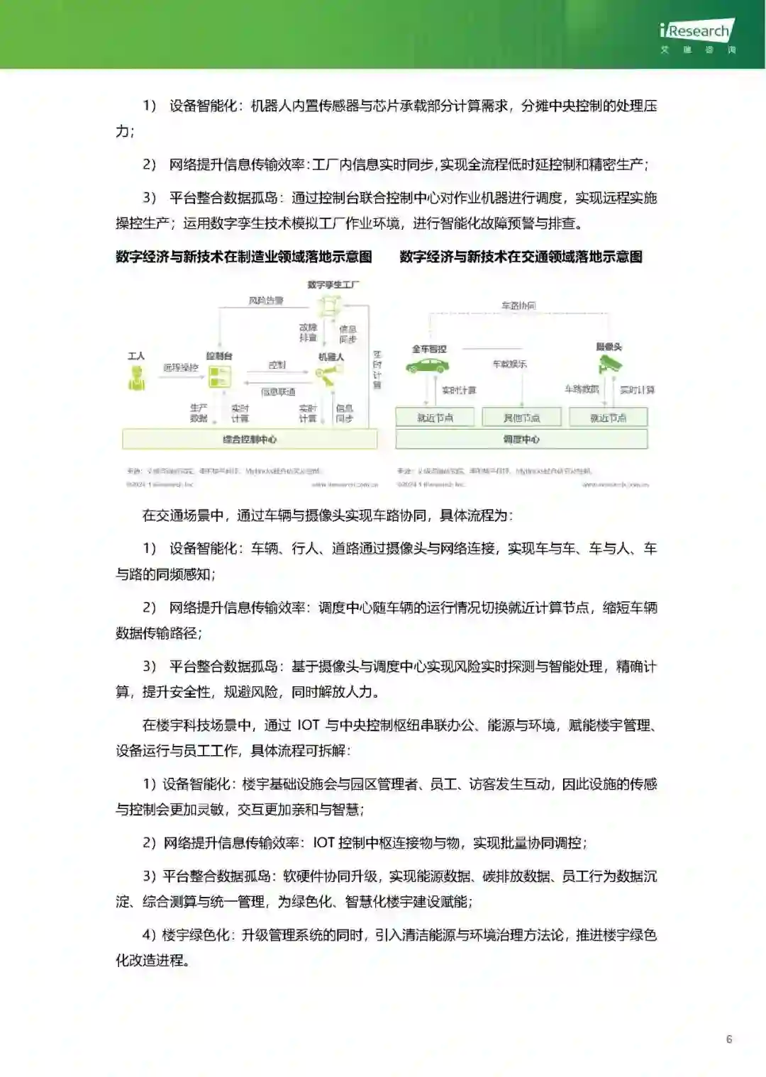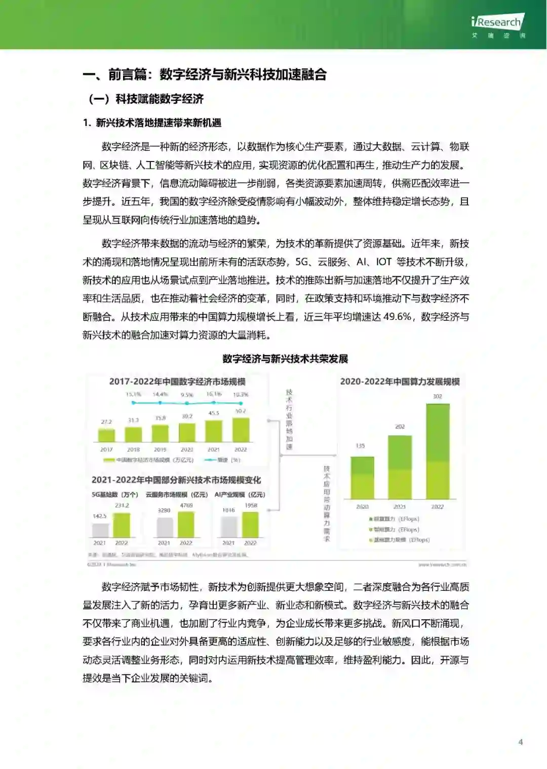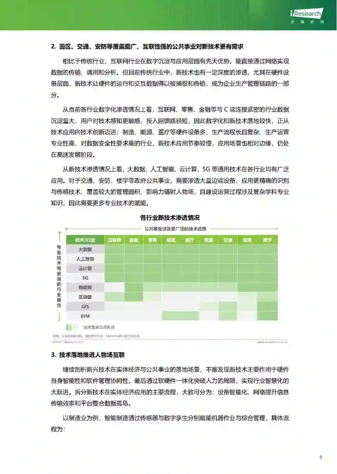 一、前言篇:数字经济与新兴科技加速融合 (一)科技赋能数字经济 1.新兴技术落地提速带来新机遇 数字经济是一种新的经济形态,以数据作为核心生产要素,通过大数据、云计算、物联网、区块链、人工智能等新兴技术的应用,实现资源的优化配置和再生,推动生产力的发展。数字经济背景下,信息流动障碍被进一步削弱,各类资源要素加速周转,供需匹配效率进一步提升。近五年,我国的数字经济除受疫情影响有小幅波动外,整体维持稳定增长态势,且呈现从互联网向传统行业加速落地的趋势。 数字经济带来数据的流动与经济的繁荣,为技术的革新提供了资源基础。近年来,新技术的涌现和落地情况呈现出前所未有的活跃态势,5G、云服务、AI、IOT等技术不断升级,新技术的应用也从场景试点到产业落地推进。技术的推陈出新与加速落地不仅提升了生产效率和生活品质,也在推动着社会经济的变革,同时,在政策支持和环境推动下与数字经济不断融合。从技术应用带来的中国算力规模增长上看,近三年平均增速达49.6%,数字经济与新兴技术的融合加速对算力资源的大量消耗。 数字经济赋予市场韧性,新技术为创新提供更大想象空间,二者深度融合为各行业高质量发展注入了新的活力,孕育出更多新产业、新业态和新模式。数字经济与新兴技术的融合不仅带来了商业机遇,也加剧了行业内竞争,为企业成长带来更多挑战。新风口不断涌现,要求各行业内的企业对外具备更高的适应性、创新能力以及足够的行业敏感度,能根据市场动态灵活调整业务形态,同时对内运用新技术提高管理效率,维持盈利能力。因此,开源与提效是当下企业发展的关键词。 2.园区、交通、安防等覆盖面广、互联性强的公共事业对新技术更有需求 相比于传统行业,互联网行业在数字沉淀与应用层面有先天优势,能直接通过网络实现数据的传输、调用和分析。但目前传统行业中,新技术也有一定深度的渗透,尤其在硬件设备层面,新技术让硬件的运行和交互数据得以被捕捉和传输,成为企业生产管理链路的一部分。 从当前各行业数字化渗透情况上看,互联网、零售、金融等与C端连接紧密的行业数据沉淀量大、用户对技术感知更敏感、投入回馈路径短,因此数字化和新技术落地较快,正从技术应用向技术创新迈进;制造、能源、医疗等硬件设备多、生产流程长且复杂、生产运营专业性高、对数据安全性要求高的行业,新技术应用节奏较慢,应用场景也相对边缘,仍处在高速发展阶段。 从新技术渗透情况上看,大数据、人工智能、云计算、5G等通用技术在各行业均有广泛应用。对于交通、安防、楼宇等政府公共事业,需要渗透大量边端设备、应用更精确的识别与传感技术、覆盖较大的管理面积、影响力辐射人物场,且建设运营过程涉及复杂学科专业知识,因此需要更多专业技术的赋能。 3.技术落地推进人物场互联 继续剖析新兴技术在实体经济与公共事业的落地场景,不难发现新技术主要作用于硬件自身智能性和软件管理协同性,最后通过软硬件一体化突破人力的局限,实现行业智慧化的大跃进。拆分新技术在实体经济应用的主要流程,大致可分为:设备智能化、网络提升信息传输效率和平台整合数据孤岛。 以制造业为例,智能制造通过传感器与数字孪生分别赋能机器作业与综合管理,具体流程为: 1)设备智能化:机器人内置传感器与芯片承载部分计算需求,分摊中央控制的处理压力; 2)网络提升信息传输效率:工厂内信息实时同步,实现全流程低时延控制和精密生产; 3)平台整合数据孤岛:通过控制台联合控制中心对作业机器进行调度,实现远程实施操控生产;运用数字孪生技术模拟工厂作业环境,进行智能化故障预警与排查。 在交通场景中,通过车辆与摄像头实现车路协同,具体流程为: 1)设备智能化:车辆、行人、道路通过摄像头与网络连接,实现车与车、车与人、车与路的同频感知; 2)网络提升信息传输效率:调度中心随车辆的运行情况切换就近计算节点,缩短车辆数据传输路径; 3)平台整合数据孤岛:基于摄像头与调度中心实现风险实时探测与智能处理,精确计算,提升安全性,规避风险,同时解放人力。 在楼宇科技场景中,通过IOT与中央控制枢纽串联办公、能源与环境,赋能楼宇管理、设备运行与员工工作,具体流程可拆解: 1)设备智能化:楼宇基础设施会与园区管理者、员工、访客发生互动,因此设施的传感与控制会更加灵敏,交互更加亲和与智慧; 2)网络提升信息传输效率:IOT控制中枢连接物与物,实现批量协同调控; 3)平台整合数据孤岛:软硬件协同升级,实现能源数据、碳排放数据、员工行为数据沉淀、综合测算与统一管理,为绿色化、智慧化楼宇建设赋能; 4)楼宇绿色化:升级管理系统的同时,引入清洁能源与环境治理方法论,推进楼宇绿色化改造进程。 在楼宇科技场景中,服务对象包含楼宇自身运营、企业管理和员工管理,同时楼宇园区内的管理元素涉及能源、资金、硬件和空间,且部分管理逻辑有共性,因此新技术应用对楼宇管理带来的变革更加明显。