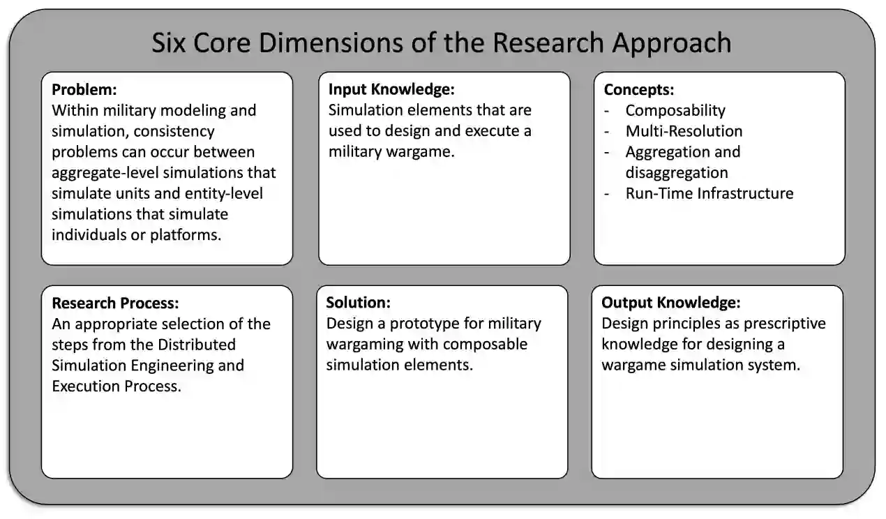 在当代军事模拟中,人们正在从全面的单体系统转向基于组件的模拟系统,以促进创新、灵活性和成本效益。尽管可重用性和可组合性对军事仿真至关重要,但它们却一直具有挑战性。重复使用可带来各种技术、商业和经济效益。可组合性对于构成当代军事仿真环境的系统之系统至关重要,由于分辨率和抽象程度不同,系统之间的联系具有挑战性。高分辨率模型有助于军事人员理解现象,而低分辨率模型则有助于定性分析理解。在这些模拟环境中,聚合级模拟代表具有多个实体的军事单元,而实体级模拟则描述个人。然而,在兵棋游戏中将这两种类型的模拟组合在一起以支持决策,仍然具有挑战性。基于对当代军事模拟的分析,提出了以下主要研究问题:可用于军事兵棋模拟系统的可组合元素的设计原则是什么?
