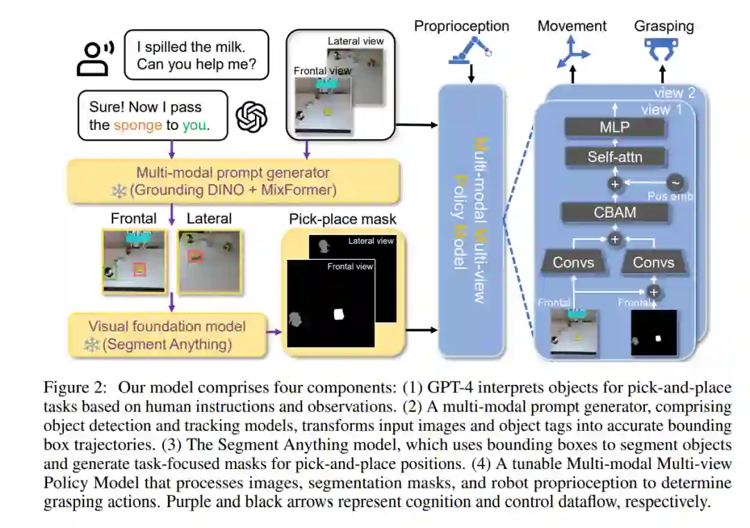 为了进一步构建一个具有自然人机交互的整体机器人系统,我们提出进一步利用大型语言模型GPT-4[13],并将两步流程设计到我们的系统中。 (1) 身体化掩模生成:我们使用GPT-4解释人类的指令,通过检测和追踪模型识别和定位物体。然后,我们采用视觉基础模型SAM[14]生成目标物体的分割掩模,作为下一步的输入。 (2) 动作预测:我们引入了一种多模态多视图策略模型(MMPM),用于联合训练RGB图像、语义掩模和机器人运动,从而实现更好的3D感知,从而导致精确的动作预测。我们精心收集了一个包含各种物体(500次示范,26个物体,5种形状类型)的机器人数据集,用于高效的拾放任务训练。我们的实验显示了我们提出的模型的有效性,特别是在泛化到未见过的物体、复杂背景和多个干扰物方面。我们的任务的简单演示如图1所示。 本文的贡献可以总结如下:(1) 我们是首批使用分割掩模将基础模型应用于通用拾放代理的研究者之一,旨在以样本效率高的方式增强其泛化能力。 (2) 我们使用Franka Emika Research 3机器人臂收集了一个精选的真实世界机器人数据集,并开发了一种多模态多视图策略模型,以进行准确的动作预测。 (3) 我们的真实世界实验结果表明,我们的控制模型可以有效地提高性能,并泛化以处理未见过的物体、新的背景和更多的干扰物。