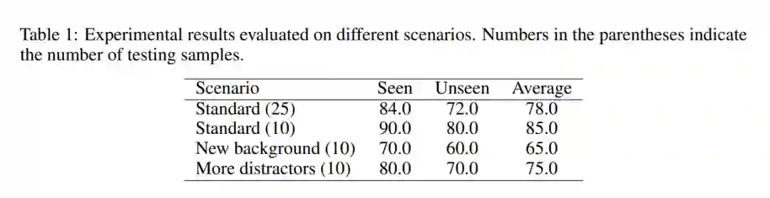 在本节中,我们首先介绍我们的数据集。然后我们在接下来的部分中详细阐述训练细节、实验设置和结果。我们首先对我们的方法的有效性以及其泛化到未见过的物体、新的背景和更多干扰物的能力进行了全面评估。为了确保更强大的评估,我们在每个设置下随机测试了大量的任务,括号中的数字表示实验任务的数量。标准环境是指与训练数据一致的,有0-2个干扰物的桌面背景。实验结果如表1所示。这些结果表明,在引入新背景时,无论是在已见或未见设置下,性能都会略有下降。然而,我们的模型对更多的干扰物表现出鲁棒性,这可以归因于在动作学习中引入了分割掩模的模式。