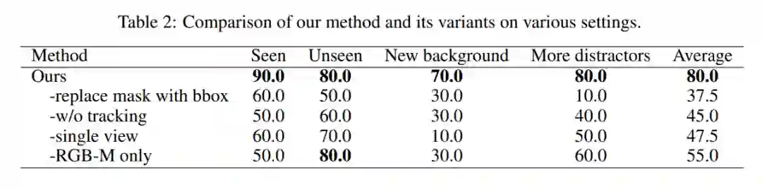 为了进一步验证我们提出的方法及其各个组件的有效性,我们将我们的方法与几种变体进行了比较。我们在四种设置中评估每种方法:1)标准环境中的已见物体;2)标准环境中的未见物体;3)新背景中的已见物体;以及 4)带有更多干扰物(随机3-6个)的已见物体。每个设置包括10个任务,因此每种方法总共有40个任务。详细的任务列表可以在附录B中找到。