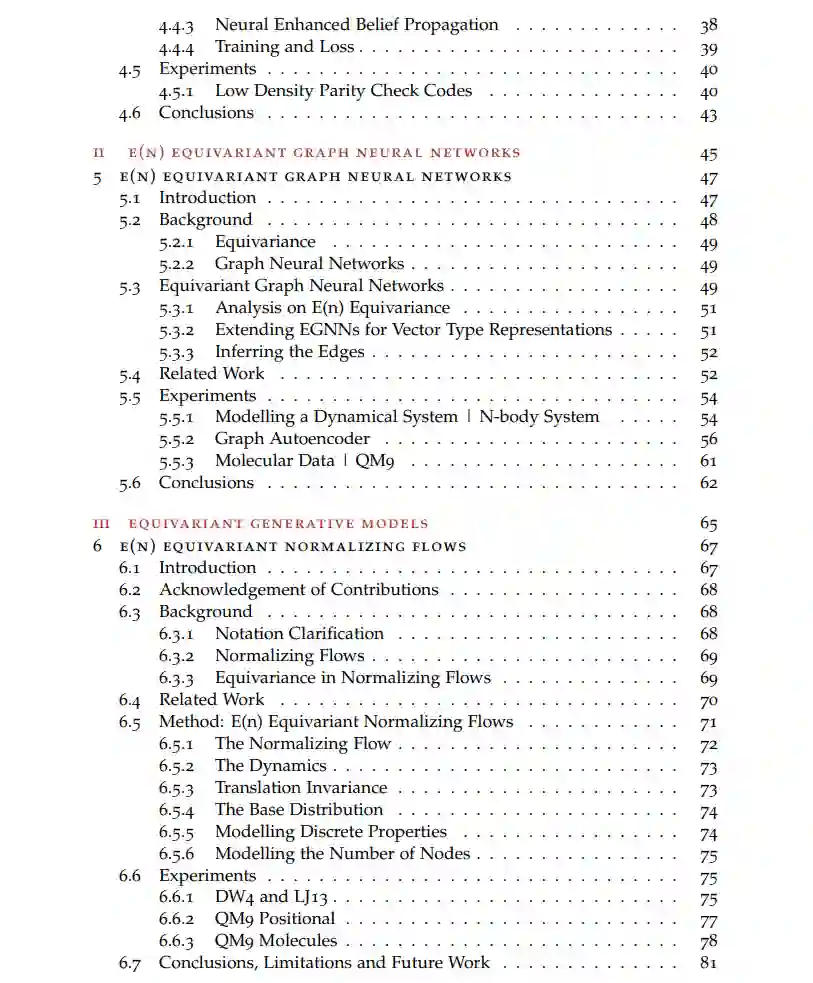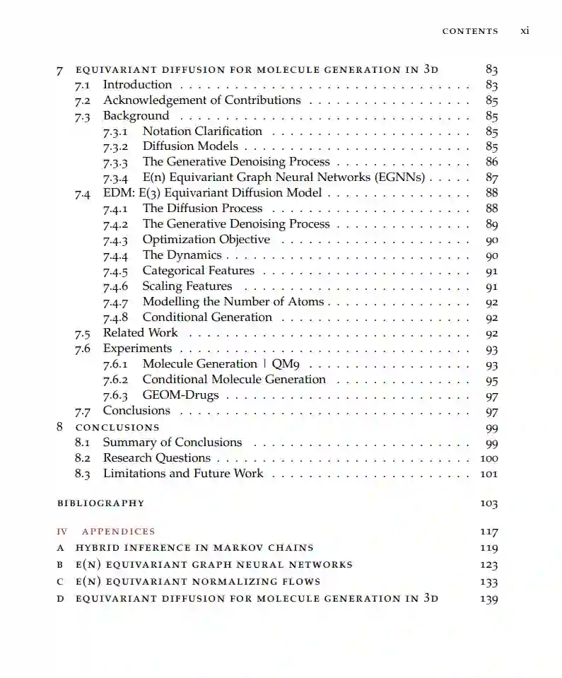 在论文的后续部分,我们重点利用在某些环境中必须严格满足的对称性,如对某些欧几里得变换的不变性或等变性。这一原则特别适用于位于三维空间中的数据,如分子数据,具有显著的实际影响潜力。我们首先构建了一个对欧几里得对称性等变的图神经网络,并在一系列判别任务(如分子性质预测)中展示了其有效性。然后,我们基于该网络设计了等变生成模型,在三维分子生成方面显著优于以前的方法,为分子建模和药物发现提供了有前途的方法。