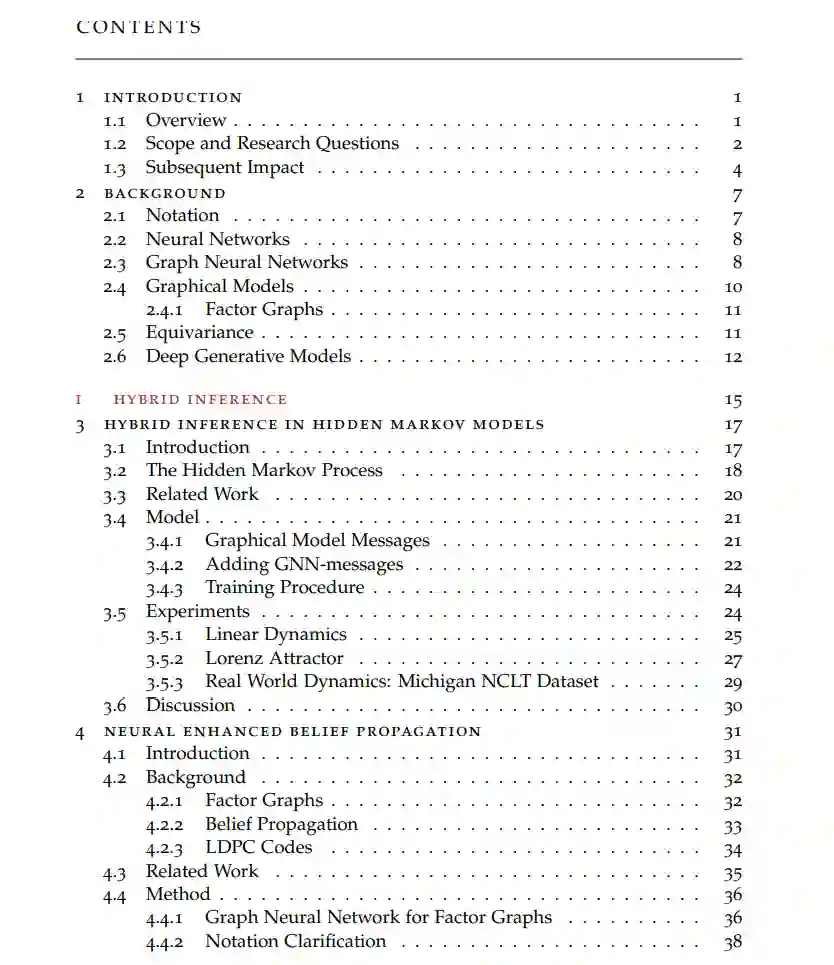 在第3章和第4章中,我们提出了一个结合图形推理和学习推理的混合消息传递框架,并将其结构化为图神经网络。通过使用交叉验证,我们可以自动平衡图形推理与学习推理的工作量。具体来说,在第3章中,我们提出了一个用于高斯隐马尔可夫模型的混合框架,这类图形模型用于卡尔曼滤波器。通过各种实验,我们证明了该框架比单独运行的学习推理或图形推理更准确地估计轨迹。在第4章中,我们将提出的框架扩展到增强信念传播,这是一种用于推理图形模型的标准算法。