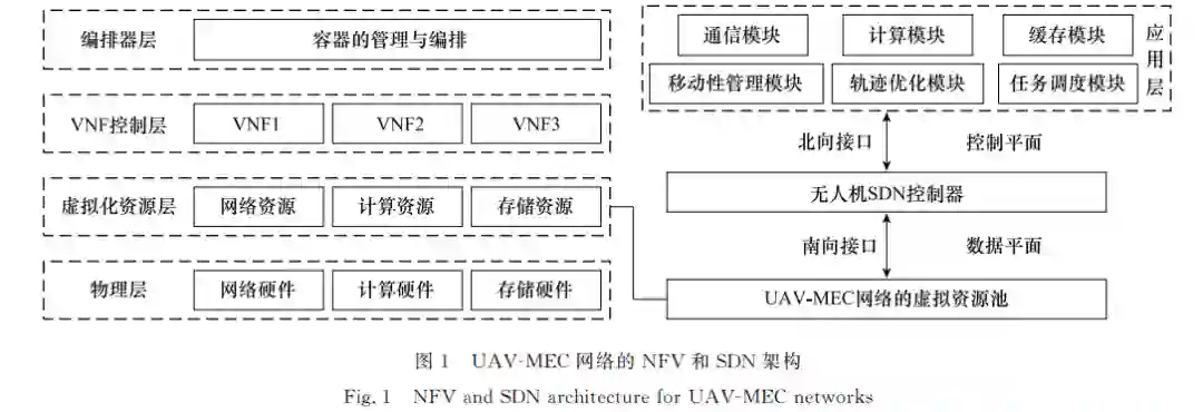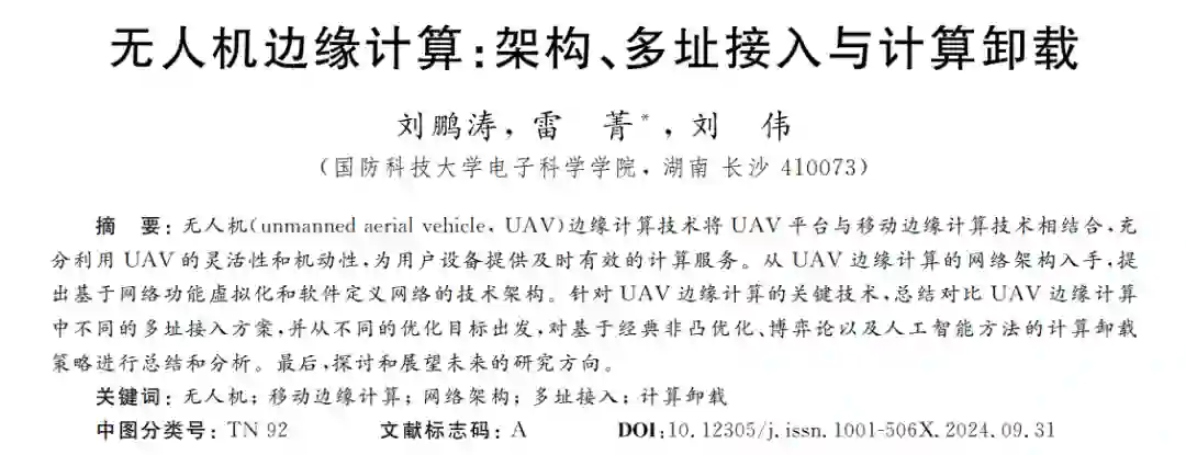 无人机(unmanned aerial vehicle, UAV)边缘计算技术将UAV平台与移动边缘计算技术相结合, 充分利用UAV的灵活性和机动性, 为用户设备提供及时有效的计算服务。从UAV边缘计算的网络架构入手, 提出基于网络功能虚拟化和软件定义网络的技术架构。针对UAV边缘计算的关键技术, 总结对比UAV边缘计算中不同的多址接入方案, 并从不同的优化目标出发, 对基于经典非凸优化、博弈论以及人工智能方法的计算卸载策略进行总结和分析。最后, 探讨和展望未来的研究方向。 近年来,无人机(unmannedaerialvehicle,UAV)通信 系统的发展呈现出迅猛的势头。这一技术领域的突飞猛进 不仅推动了 UAV 行业的快速发展,也为各个领域带来了 新的可能性和前景。首先,UAV通信系统在军事领域发挥 着越来越重要的作用。军事部队利用 UAV 进行侦察、监 视、目标定位等任务,而这些任务的成功执行离不开高效可 靠的通信系统。其次,在商业领域,UAV通信系统的迅速 发展也催生了诸多应用。从快递配送到农业植保,UAV 在商业运营中的应用场景日益丰富。随着消费级 UAV 市场的不断扩大,普通消费者对 UAV通信系统的需求也 与日俱增。在娱乐、摄影等领域,UAV已经成为了常见的 工具,而其通信系统的稳定性、传输速度等方面的提升,将进一步满足用户对于 UAV功能和性能的需求。UAV通 信系统的发展不仅仅受益于 UAV本身技术的进步,同时 也离不开通信技术的创新。随着5G、物联网、边缘计算等 新一代通信技术的不断成熟[1],UAV通信系统的性能将 得到极大的提升,从而为 UAV的广泛应用打下更加坚实 的基础。 另一方面,随着信息技术的快速发展,终端设备的数量 不断增加。移动互联网服务的爆炸式增长催生了各种需要 大量计算的应用程序,如虚拟现实、增强现实、自动驾驶、人 工智能、数据分析等应用。终端的计算任务对时延要求越 来越高,这给计算能力有限的终端用户带来了沉重的计算 负担,算力资源受限与低时延要求的矛盾越来越突出。现 有的云计算面临着核心网传输时延过长的问题,无法及时 满足终端设备数据流量爆炸式增长的计算处理需求。而移 动边缘计算(mobileedgecomputing,MEC)[2]可以将云端 的计算资源下沉到网络边缘,减少核心网带宽占用,为终端 用户提供及时有效的计算服务,降低任务计算时间。传统 的 MEC系统通常将 MEC服务器部署于基站、接入点等网 络边缘位置。由于其固定的架构,存在灵活性差、部署成本 高的问题。然而,未来的网络不仅需要能够适应动态和异 构的环境,还应该能够以快速和高可靠的方式支持热点区 域和临时的任务计算。最近研究表明,MEC服务器也可以 搭载于 UAV[3]。Axellio公司针对 UAV 开发出了一款轻 量级边缘计算平台FabricXpress[4]。 相较于传统的地面 MEC 网络,UAV 辅助的 MEC (UAVMEC)网络有以下优势:① UAV可以在荒野、沙漠、 受灾地域、军事行动等多数情况下灵活部署。② UAV 能 够与地面用户、基站建立视距链路(lineofsight,LoS)[5], 从而扩大服务覆盖范围、提高数据传输的稳定性和可靠性, 并有助于提高计算性能。③ UAV的移动性能够适应用户 设备数量、位置和服务需求的不断变化,从而为移动用户提 供无缝计算服务,保证计算服务的连续性,并可为其他计算 资源受限的 UAV提供支持。此外,在 UAV进行搜索和救 援时,处理图像所需的计算能力和存储能力较强,以人脸识 别为代表的任务需求需要实时上传视频并进行决策。对于 计算能力有限的 UAV,可以将这些计算密集型任务转移至 MEC服务器、空闲的 UAV、地面基站或接入点。 目前,已经有一些关于 UAV 和边缘计算的相关研究 综述文章。在 UAV的综述中,文献[6]对 UAV网络中多 种接入技术进行全面的总结与对比。文献[7]回顾非正交 多 址 接 入 (nonorthogonalmultipleaccess,NOMA)在 UAV网络中的应用。在边缘计算的综述中,文献[8]提出 MEC技术的实现依赖于网络功能虚拟化(networkfunction virtualization,NFV)和软件定义网络(softwaredefinednet work,SDN),并将虚拟化的资源通过虚拟功能网元(virtual networkfunction,VNF)执行。文献[9]针对 MEC中的计 算卸载方案进行分析总结。在 UAVMEC网络的综述中, 文献[10]简要介绍 UAVMEC网络的体系架构、任务卸载 的工作原理、计算卸载时采用的不同接入方案。文献[11] 提出一种融合 UAV 和边缘计算的网络架构,并简单分析 总结多用户接入技术与计算卸载策略。文献[12]探索一种 基于SDN的 UAVMEC框架。文献[13]对 UAVMEC网 络的资源优化问题进行综述,提出基于软件定义 UAV 网 络的总体架构。文献[14]中简要概述 UAV 搭载 MEC设 备的基本网络架构,重点对现有的卸载算法进行了调查和 分析对比。文献[15]总结多 UAVMEC网络中多址接入 与计算卸载决策。文献[16]总结利用智能方法解决 UAV MEC网络中以最小化能耗、最小化时延、最大化任务处理 数为目标的资源优化问题。限于篇幅和侧重点,上述综述 文章只是简单地介绍 UAVMEC网络中的技术架构和多 用户接入方案。本文的创新之处在于针对 UAVMEC网 络的技术架构进行详细的介绍,从多用户接入的角度出发, 详细对比多种接入方案,并分析其对计算卸载时延与能耗 性能的影响,给出多种最新的计算卸载策略。通过详细描 述 UAVMEC网络的技术架构,更好地了解该网络的组成 部分。通过对比不同的接入方案,综述给出对计算卸载性 能的影响,为读者提供了深入分析、选择接入