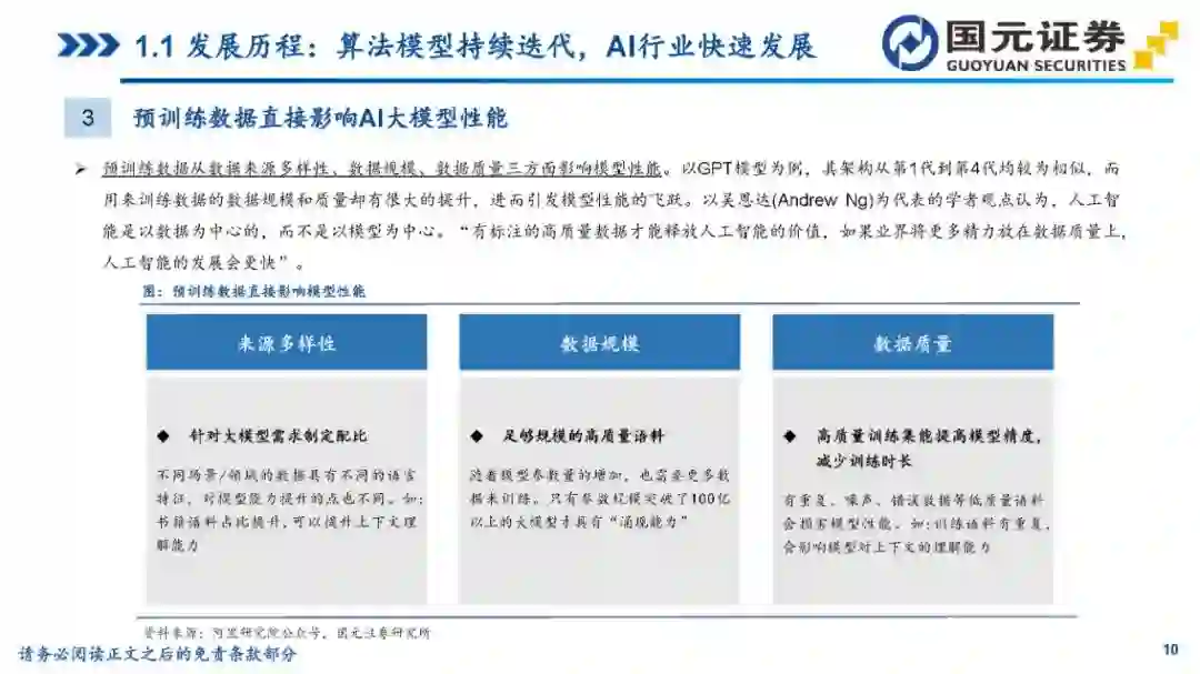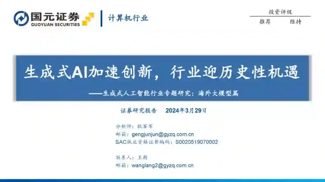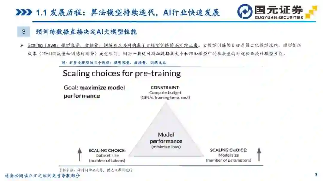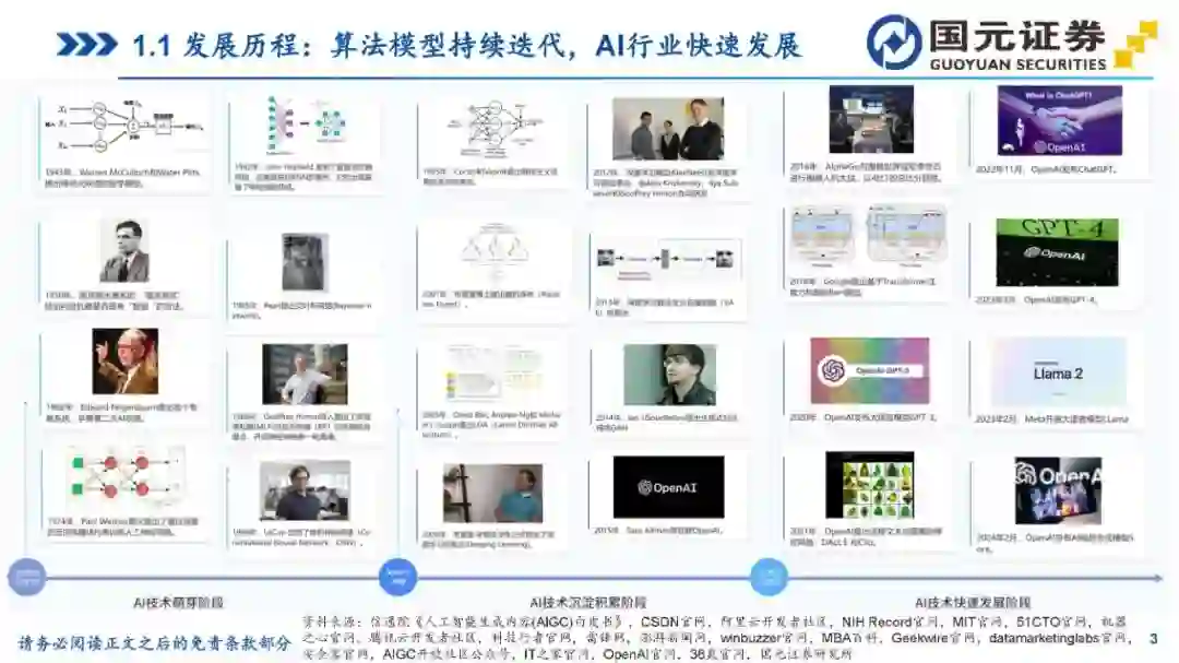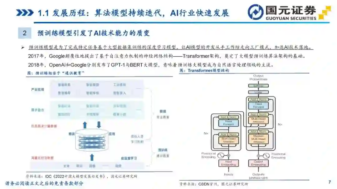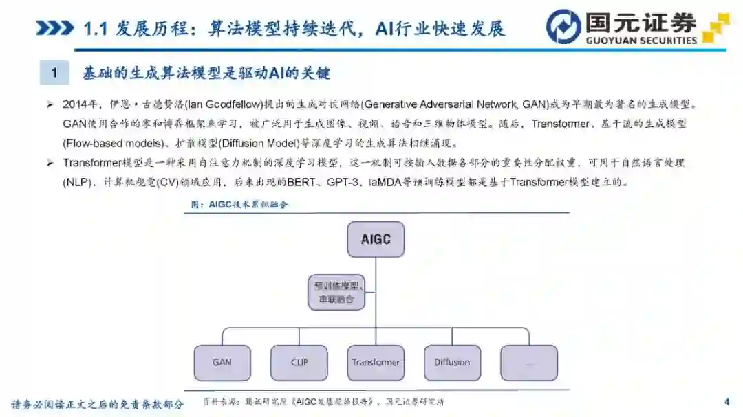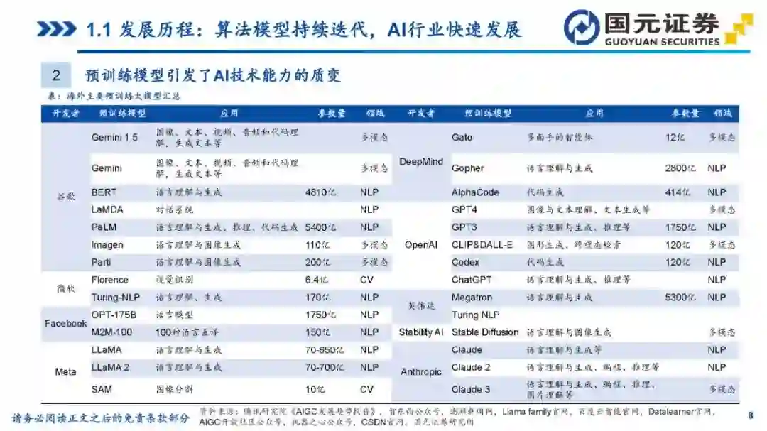 第一部分:生成式AI快速发展,技术奇点有望到来 第二部分:技术创新百花齐放,海外巨头引领创新 第三部分:风险提示 1.1发展历程:算法模型持续迭代,AI行业快速发展 1基础的生成算法模型是驱动AI的关键 2014年,伊恩·古德费洛(lanGoodfellow)提出的生成对抗网络(GenerativeAdversarialNetwork,GAN)成为早期最为著名的生成模型。GAN使用合作的零和博弈框架来学习,被广泛用于生成图像、视频、语音和三维物体模型。随后,Transformer、基于流的生成模型(Flow-basedmodels)、扩散模型(DiffusionModel)等深度学习的生成算法相继涌现。 Transformer模型是一种采用自注意力机制的深度学习模型,这一机制可按输入数据各部分的重要性分配权重,可用于自然语言处理(NLP)、计算机视觉(CV)领域应用,后来出现的BERT、GPT-3、laMDA等预训练模型都是基于Transformer模型建立的。 通过梳理全球主流大语言模型(LLM)的发展脉络,2018年以来的GPT系列、LLaMA系列、BERT系列、Claude系列等多款大模型均发源于Transformer架构。 2预训练模型引发了AI技术能力的质变 预训练模型是为了完成特定任务基于大型数据集训练的深度学习模型,让AI模型的开发从手工作坊走向工厂模式,加速AI技术落地。 2017年,Google颠覆性地提出了基于自注意力机制的神经网络结构——Transformer架构,奠定了大模型预训练算法架构的基础。 2018年,OpenAI和Google分别发布了GPT-1与BERT大模型,意味着预训练大模型成为自然语言处理领域的主流。 3预训练数据直接决定AI大模型性能 ScalingLaws:模型容量、数据量、训练成本共同构成了大模型训练的不可能三角。大模型训练的目标是最大化模型性能,模型训练成本(GPU的数量和训练时间等)是受限的,因此一般通过增加数据集大小和增加模型中的参数量两种途径来提升模型性能。