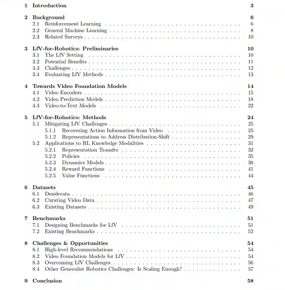 这些有前景的机会,加上近期在LfV方面的鼓舞人心的进展[Yang等人,2023c; Bruce等人,2024],强烈表明LfV的承诺好处是完全可以实现的。我们希望这份全面的综述能鼓励和通知未来的LfV研究,最终有助于加速我们创建通用型机器人的进程。