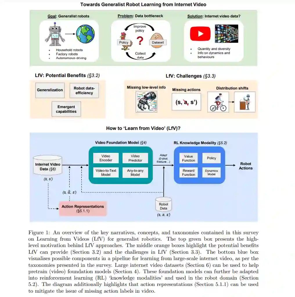 最后,我们审查LfV数据集和基准,然后通过讨论LfV中的挑战和机会来结束这篇综述。在这里,我们倡导可扩展的方法,这些方法可以利用可用数据的全部范围,并针对LfV的关键好处。总的来说,我们希望这篇综述能够成为LfV新兴领域的全面参考资料,催化该领域的进一步研究,并最终有助于通用机器人的进展。