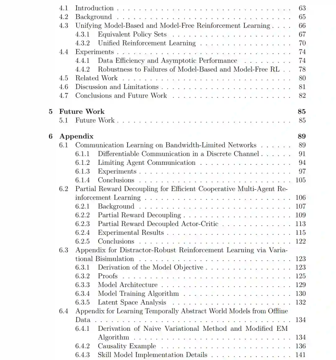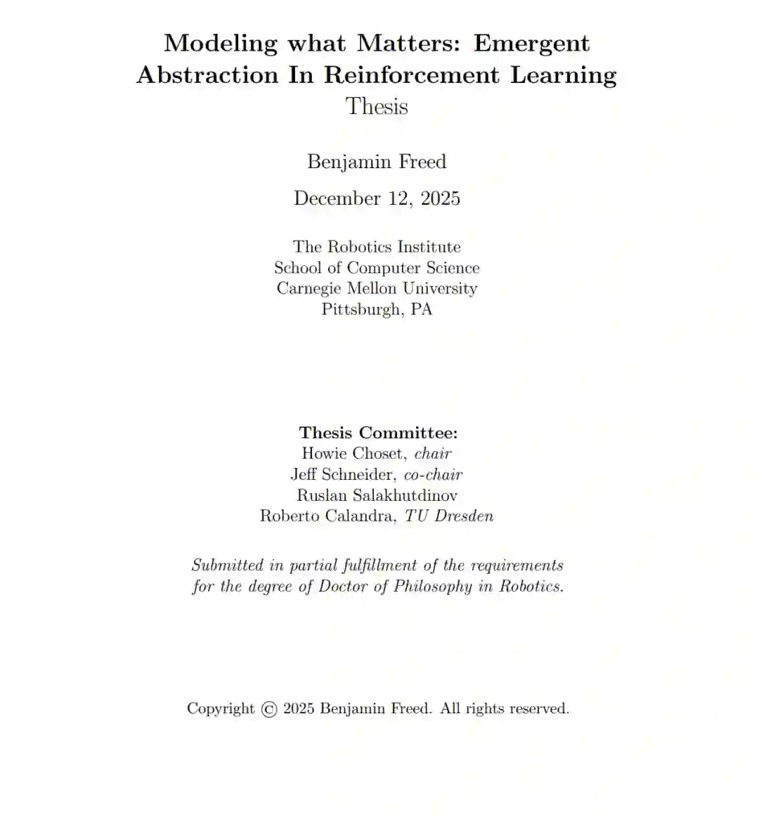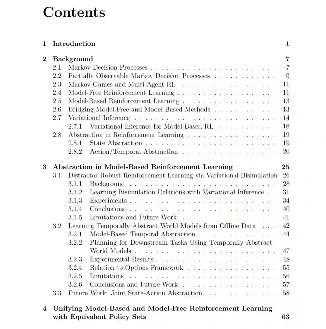 现实世界的决策任务充满了部分可观测性、长时程逻辑以及复杂的多智能体交互。本论文指出,抽象(Abstraction)——即构建保留关键信息并简化任务表征的过程——为应对无模型(Model-free)和有模型(Model-based)强化学习(RL)中的上述挑战提供了一个统一的原则。我们开发了一系列方法,使抽象不再依赖于手动设计,而是从学习目标中涌现(Emerge),从而产生的表征能够显著增强智能体应对高维观测、长程时间依赖以及智能体间耦合的能力。 在无模型多智能体方面,我们引入了局部奖励解耦(Partial Reward Decoupling, PRD)机制。这是一种博弈抽象机制,能够动态地将团队分解为子小组,从而简化跨智能体的信用分配并加速协作学习。此外,我们研究了带宽受限下的离散通信学习,使智能体能够学习在何种时机、向谁发送何种编码信息,进而将通信学习与表征学习及生成模型联系起来。 我们进一步展示了抽象如何缓解有模型 RL 中常见的模型学习与任务目标之间的失配问题。通过将有限的模型容量聚焦于任务相关因子,并在合适的时间尺度上运行,抽象能够提升世界模型在决策中的效用。为此,我们探索了利用**变分推断(Variational Inference, VI)来同时学习状态抽象和时间抽象。我们展示了一套状态抽象方法,该方法在剔除干扰细节的同时保留任务相关特征,在含有大量干扰项的控制基准测试中取得了强劲表现,且无需依赖数据增强启发式方法。同时,我们提出了一种基于隐变量的时间抽象方法,从离线数据中提取技能并学习时间抽象动力学模型,实现了对下游任务的高效长程预测与规划。 最后,我们提出了统一强化学习(Unified RL)**架构。该架构通过检测学习模型何时不再对策略提升有益,并适时回退至无模型学习更新,从而实现了有模型与无模型更新的融合。实证结果表明,Unified RL 在保持有模型方法高数据效率的同时,达到了与无模型 RL 相当的渐近性能。