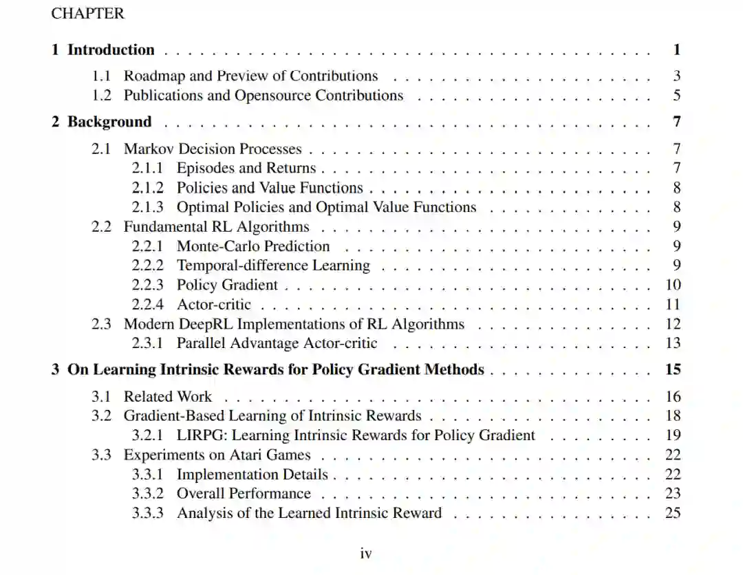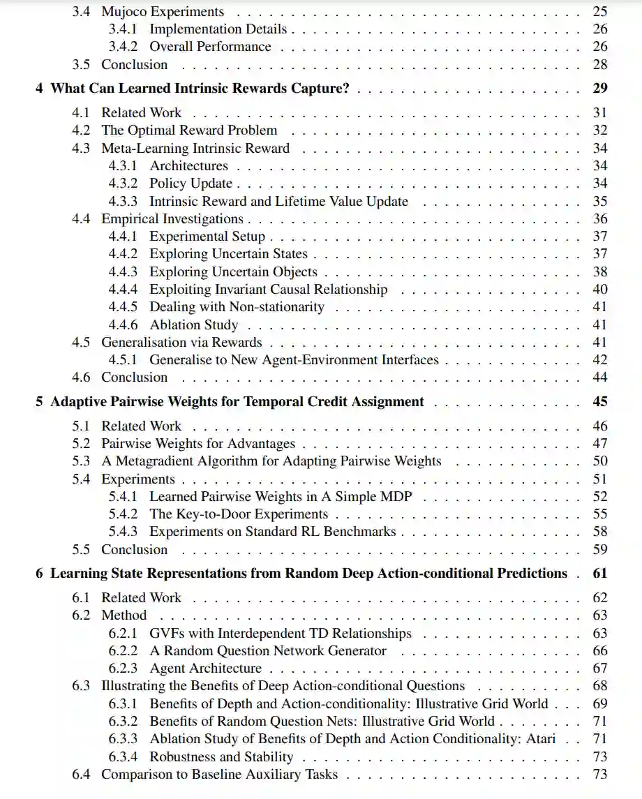 **本文旨在进一步推进深度学习技术。**具体而言,本文在以下四个方面做出了贡献:1)在奖励设计方面,提出了一种新的元学习算法,用于学习有助于策略优化的奖励函数。该算法提高了策略梯度方法的性能,并优于手工设计的启发式奖励函数。在后续研究中,学习到的奖励函数可以捕获关于长期探索和开发的知识,并可以泛化到不同的强化学习算法和环境动态的变化。2)在时间信用分配中,本文探索了基于成对权重的方法,这些权重是采取行动的状态、收到奖励的状态和之间经过的时间的函数。本文开发了一种元梯度算法,用于在策略学习期间自适应这些权重。实验表明,该方法比其他方法取得了更好的性能。3)在状态表示学习中,本文研究使用随机深度动作条件预测任务作为辅助任务,以帮助智能体学习更好的状态表示。实验表明,随机的深度动作条件预测通常可以产生比手工设计的辅助任务更好的性能。4)在模型学习和规划中,提出了一种学习价值等价模型的新方法,这是一类最近表现出强大经验性能的模型,推广了现有的方法。实验结果表明,该方法能够提高模型预测精度和下游规划过程的控制性能。
