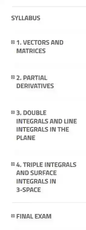 课程描述: 本课程涵盖多变量函数的微分、积分和向量演算。这些数学工具和方法广泛应用于物理科学、工程、经济学和计算机图形学中。