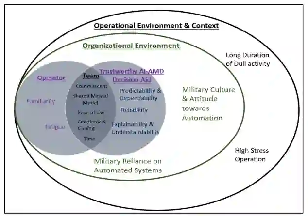 基于功能分配的操作员和AI-AMD决策辅助工具之间的人机交互研究表明,操作员和AI-AMD决策辅助工具应该被设计成在大多数杀戮链功能中作为一个 "团队"运作。这引导论文研究了单独和集体考虑人类和决策辅助的信任因素。对操作员和人工智能-AMD决策之间的人机交互的研究还显示,操作员的角色已经从手动控制器变成了监督控制器。因此,一个值得信赖的决策辅助工具是很重要的,因为操作者会期望系统的表现符合预期,以帮助操作者更好地履行他的角色。另外,为了进一步帮助减轻操作者的认知工作量,信息的外部表示、决策辅助工具的建议必须易于阅读和理解。