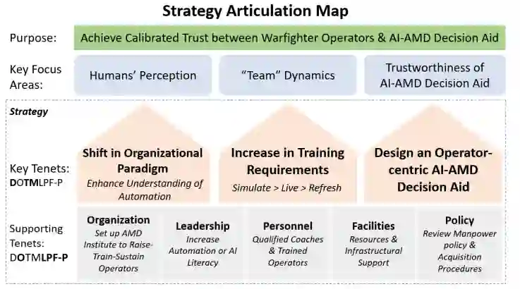 图4显示了拟议的战略衔接图,以实现操作者和AI-AMD辅助决策之间的校准信任。对信任定义、人机界面和信任因素的审查表明,该战略应关注三个关键领域:(1)人类对自动化技术和AI-AMD决策辅助系统的集体和个人感知;(2)增强操作员和AI-AMD决策辅助系统的团队活力;(3)AI-AMD决策辅助系统的可信度,重点是系统开发。该战略利用DOTMLPF-P框架提出了三个关键原则和五个支持原则。首先,军事作战人员需要被告知自动化技术的真正能力和局限性,特别是AI-AMD辅助决策。第二,操作员的培训要求必须增加,以应对新的工作范围和不断变化的威胁。第三,必须在人工智能-AMD决策辅助系统的开发中加入新的要求,以提高系统的可感知的可信度。这三个关键原则得到了DOTMLPF-P框架其他方面的支持,如组织、领导、人员、设施和政策。