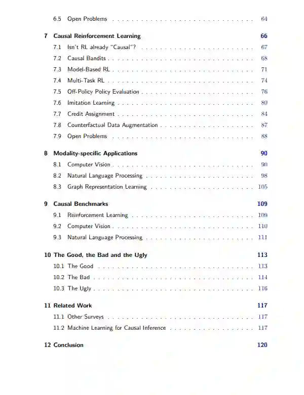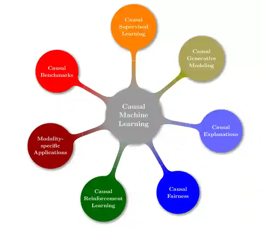 因果机器学习(CausalML)是将数据生成过程形式化为结构因果模型(SCM)的机器学习方法的总称。这使得人们可以对这一过程的变化的影响(即干预)和事后会发生什么(即反事实)进行推理。根据他们所解决的问题,我们将CausalML中的工作分为五组:(1)因果监督学习,(2) 因果生成模型,(3) 因果解释,(4) 因果公平,(5) 因果强化学习。对每一类方法进行了系统的比较,并指出了有待解决的问题。此外,我们回顾了特定模式在计算机视觉、自然语言处理和图形表示学习中的应用。最后,我们提供了因果基准的概述,并对这一新兴领域的状态进行了批判性的讨论,包括对未来工作的建议。