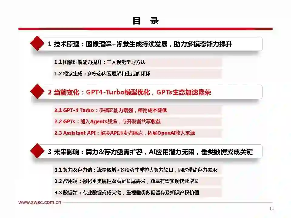 当前变化:GPT4-Turbo模型优化,GPTs生态加速繁荣。2023年11月7日,OpenAI通过开发者大会推出新产品:1)GPT4-Turbo:该模型通过增加上下文窗口以支持更长的工作流,同时具备视觉和语音等多模态能力,输入和输出的tokens价格大幅下降,从而帮助开发者以更低的价格获取更高的模型性能。2)GPTs:用户只需输入指令并提供外设的知识库即可创建专属GPT,应用开发门槛大幅降低,未来在收益计划的助力下,AI应用有望迎来大爆发,形成全新的AIAgent生态。3)AssistantAPI:开发者可以通过函数调用、知识检索、代码解释器简化应用开发流程、实现效率提升。 未来影响:算力&存力亟需扩容,AI应用潜力无限,垂类数据或成关键。1)算力端:OpenAI一系列新产品的推出成功打开新流量入口,更多的用户和开发者希望参与其中,巨大的流量对算力底座提出更高的要求;叠加图片等多模态生成所要求的tokens计算量远高于文本模态(根据OpenAI官网信息推算,在GPT-4-Turbo的Visionpricingcalculator高保真度模式下,1张图片所产生的tokens数大约是1个单词的570或830倍),算力供给亟需扩容。2)存力端:在算力提效到达一定瓶颈的情况下,AI芯片未来将逐步通过堆叠HBM的方式来提升性能,扩大单位算力的存储能力,HBM等存力需求将迎来暴增。3)应用端:类比移动互联网时代,AI时代的应用市场有望如同移动互联网时代具备无限潜力,GPTs数量将呈现非线性高速增长;此外,OpenAI的GPTs通过提供API,使得开发者只需喂给大模型更多的垂类数据即可打造垂类AI应用,同时使满足更多长尾需求成为可能。4)数据端:从OpenAIGPTs的Knowledge功能来看,专业知识与大模型通用能力的结合将成为未来的重中之重,私域数据库和专业数据库方向将会不断产生新热点、新需求,因此,如何在合规前提下留存垂类数据并构建体系化数据库、以及保证知识产权的确权或成为未来的重要议题。