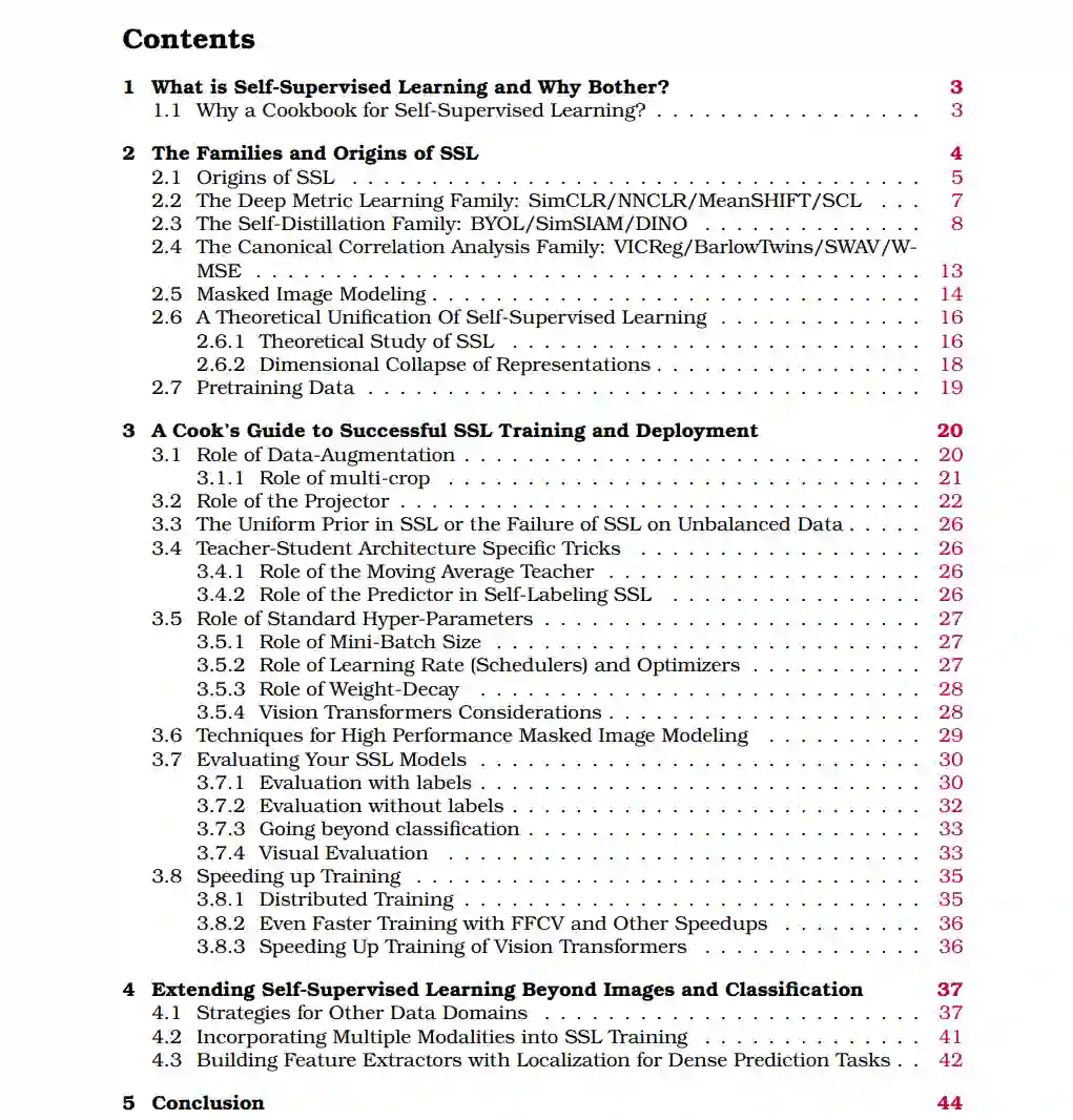 此外,实证驱动的自监督学习(SSL)包含许多不同的部分(主要是超参数),这些部分可能会影响最终表示的关键属性,并且在已发表的工作中未必详细说明。也就是说,要开始研究自监督学习方法,首先必须通过实证检测这些方法,以充分了解所有这些部分的影响和行为。这样的实证盲点是很大的局限性,因为它们需要大量的计算资源和预先存在的实践经验。总之,看似不同但实际上重叠的方法产生的最先进的性能、现有的理论研究较少以及实际应用广泛,这使得有一个统一这些技术及其配方的教材变得至关重要,以降低自监督学习的研究门槛。我们的目标是通过以教材风格奠定自监督学习基础和最新的配方来降低进入自监督学习研究的门槛。要想成功烹饪,您必须首先学会基本技巧:切、炒等。我们从第2部分开始,使用通用词汇介绍自监督学习的基本技巧。具体来说,我们描述了方法的家族以及将它们的目标联系在一起的统一视角中的理论线索。我们强调了诸如损失项或训练目标等关键概念,并将它们放在概念框中。接下来,厨师必须学会熟练地运用技巧制作出美味的菜肴。这需要学习现有的配方、组装食材和评估菜肴。在第3部分,我们介绍实现自监督学习方法成功的实际考虑因素。我们讨论了常见的训练配方,包括超参数选择,如何组装组件(如架构和优化器)以及如何评估自监督学习方法。我们还分享了来自顶级研究人员的关于常见训练配置和陷阱的实用技巧。我们希望这本教材能为成功训练和探索自监督学习提供实用的基础。