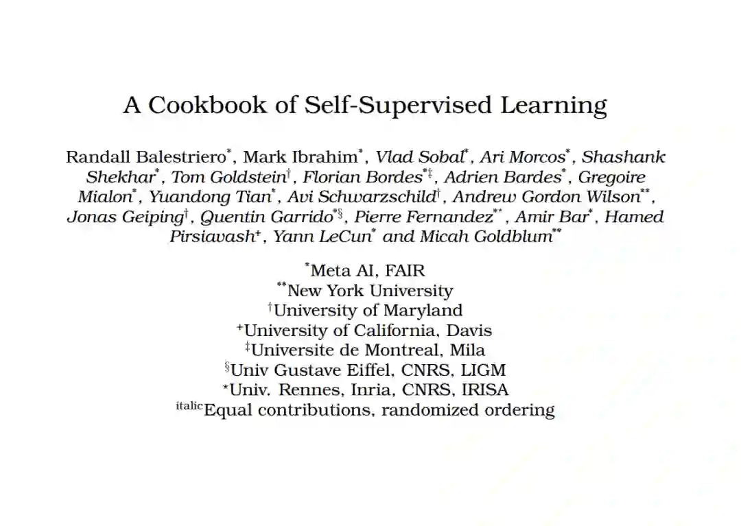 自监督学习根据未标记输入定义一个预处理任务,生成描述性和可理解的表示[Hastie等人,2009,Goodfellow等人,2016]。在自然语言中,一个常见的自监督学习目标是掩盖文本中的一个单词,预测周围的单词。预测单词上下文的目标鼓励模型在不需要任何标签的情况下捕捉文本中单词之间的关系。相同的自监督学习模型表示可以用于一系列下游任务,如跨语言翻译文本、总结甚至生成文本等等。在计算机视觉领域,类似的目标存在于像MAE或BYOL这样的模型中,它们学会预测图像或表示的掩码部分[Grill等人,2020,He等人,2022]。其他自监督学习目标鼓励通过添加颜色或裁剪等方式形成的相同图像的两个视图映射到相似的表示。利用大量未标记数据进行训练带来了诸多好处。虽然传统的监督学习方法通常是基于可用的标记数据,根据特定任务进行训练,但自监督学习学习到的通用表示在许多任务中都有用。在医学等领域,标签成本高昂或特定任务无法预先知道的情况下,自监督学习尤其有用[Krishnan等人,2022,Ciga等人,2022]。还有证据表明,与监督学习方法相比,自监督学习模型可以学习到更具鲁棒性的表示,更能抵抗对抗性样本、标签损坏和输入扰动,并且更加公平[Hendrycks等人,2019,Goyal等人,2022]。因此,自监督学习是一个越来越受关注的领域。然而,就像烹饪一样,训练自监督学习方法是一门精湛的艺术,门槛很高。 尽管研究人员对自监督学习(SSL)的许多组成部分较为熟悉,但成功训练一个SSL方法涉及到从预处理任务到训练超参数的一系列令人眼花缭乱的选择。由于(i)计算成本高,(ii)缺乏详细介绍实现所需复杂方法的完全透明论文,以充分发挥SSL潜力,以及(iii)缺乏统一的词汇和理论视角,SSL研究的门槛较高。由于SSL与传统的基于重构的无监督学习方法(如去噪、变分自动编码器)[Vincent等人,2008,2010,Kingma和Welling,2013]确立了不同的范式,我们对于从统一视角理解SSL的词汇有限。事实上,试图在单一视角下统一SSL方法的尝试仅在过去一年开始出现[HaoChen等人,2021,Balestriero和LeCun,2022,Shwartz-Ziv等人,2022,Garrido等人,2022b]。在没有一个共同基础来描述SSL方法的不同组成部分的情况下,研究人员开始研究SSL方法变得更具挑战性。与此同时,由于SSL如今在现实世界中得到广泛应用,SSL研究迫切需要新的研究人员。然而,关于SSL的泛化保证、公平性特性以及对抗性攻击或自然发生的变异的鲁棒性等方面仍存在许多尚待解决的研究问题。这些问题对SSL方法的可靠性至关重要。