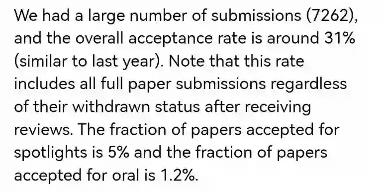 本届会议共收到了 7262 篇提交论文,接收 2260 篇,整体接收率约为 31%,与去年持平(31.8%)。此外 Spotlights 论文比例为 5%,Oral 论文比例为 1.2%。