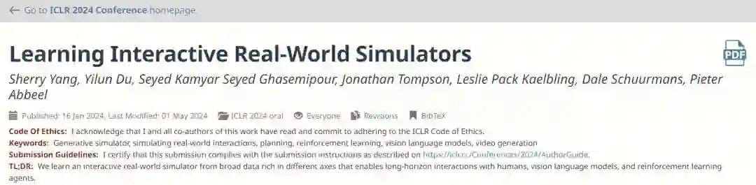 论文地址:https://openreview.net/forum?id=sFyTZEqmUY * 机构:UC 伯克利、 Google DeepMind 、 MIT 、阿尔伯塔大学 * 作者:Sherry Yang、 Yilun Du 、 Kamyar Ghasemipour、Jonathan Tompson、Leslie Kaelbling、Dale Schuurmans、Pieter Abbeel