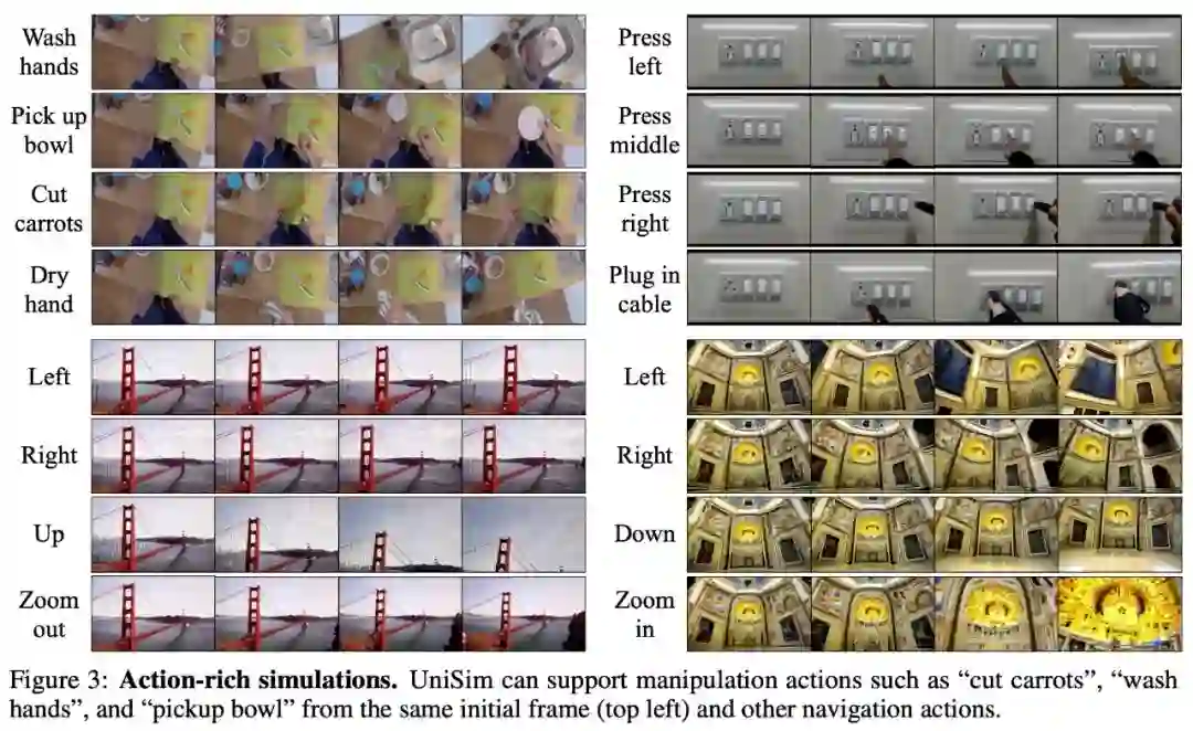 如下图 3 所示,UniSim 能够模拟一系列丰富动作,例如厨房场景中洗手、拿碗、切胡萝卜、擦干手这一系列动作;图 3 右上是按下不同的开关;图 3 下是两个导航场景。