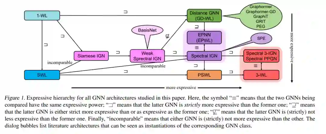 我们首先引入了一个设计谱不变GNNs的统一消息传递框架,称为特征空间投影GNN(EPNN)。综合分析显示,EPNN本质上统一了所有之前的谱不变架构,因为它们要么严格地不如EPNN表达能力强,要么与EPNN等效。还建立了不同架构之间的细粒度表达能力层次。另一方面,我们证明了EPNN本身被最近提出的一类子图GNNs所限制,这意味着所有这些谱不变架构的表达能力都严格低于3-WL。