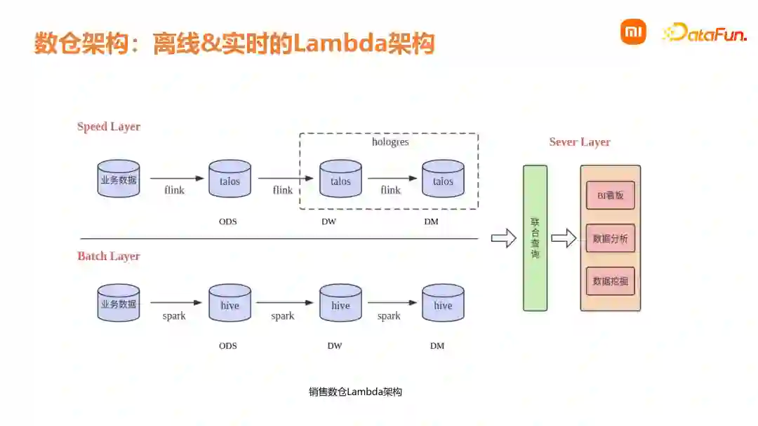 小米的销售数仓采用的是 Lambda 架构。销售数据是集团数仓中的核心之一,内部关注度高。如果是流处理,部分情况下无法达到百分之百的准确性,因此需要通过批处理,去保证 T+1 数据的准确性。在批处理层使用 Spark 加 Hive 去处理离线数据。在流式处理层,使用 Flink 加消息队列 Talos。在 DW 和 DM 层,会通过 Hologres 进行维表的加速查询。最终再把这两部分数据进行联合,提供给下游业务方使用。