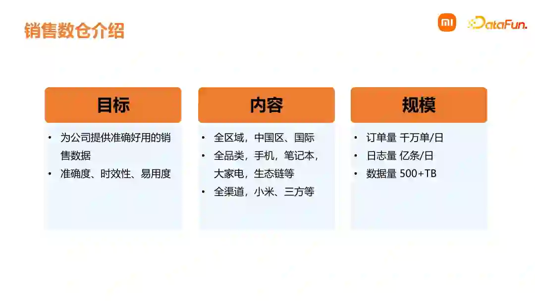 01****销售数仓介绍首先介绍下小米销售数仓,包括发展历程、销售数仓定义、数据获取使用、销售数仓的内容和规模。在 2019 年前,小米的中国区、国际部等业务数据团队在进行独立的数仓建设,这个时期是烟囱式的开发。随着业务飞速发展,在集团技术委 ABC(AI、Big data、Cloud)策略的指导下,开始建设统一的销售数仓。在 2020 年,完成了离线销售数仓的建设,同时在筹备实时数仓的建设。2021 年,实时数仓建设完毕,随着后续的业务和技术升级,进入了迭代优化和数据应用阶段。 小米的销售数仓整体上就是存放整个公司销售数据的仓库,包括了订单数据、物流数据、门店数据、用户行为数据及商品数据,并按照维度建模和规范进行建设的高效数据集合。