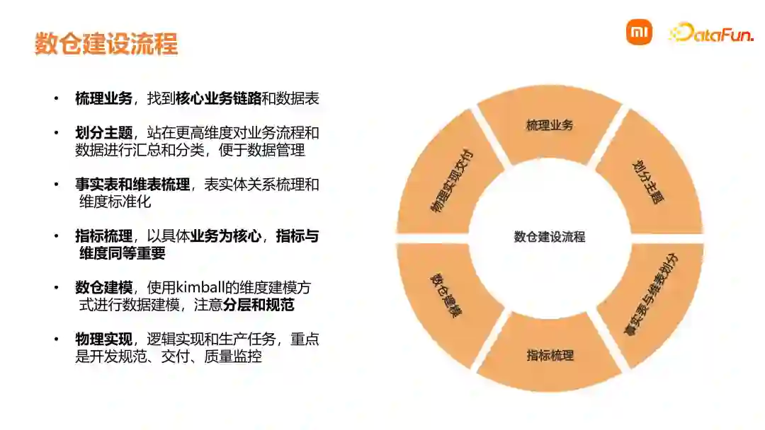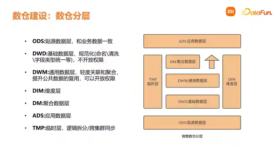 问答环节******Q1:支付订单完成订单之后,可能会发生周期性退款的问题,正常的 DWD 模型或 DWS 模型通常会存在多分区表,针对这种类似于多状态不断更新的表,例如有一段退款之后就会发生历史回溯修改 DWS 模型,小米是如何解决的?**A1:我们是通过离线的方式去对数据准确性进行修正。在离线里面会跑全量数据,即每次跑的时候是从 ODS 层采集到 DW 层的处理,以及 DM 层,每个分区里面都是全量数据。这一块计算会比较重,用来解决状态经常变化的问题。**Q2:数据权限一般存储在哪一层?**A2:我们会有一个平台部门去负责整体的数据权限,我们在每一层,从ODS到DWD、DWM都会有权限管控。**Q3:物流这块引入 Kudu 或者 Doris 可以吗?**A3:目前在部门内部 Kudu 是将要被替换的状态。因为 Kudu 是一个相对小众的产品,运维成本会比较高。我们正在用阿里的 Hologres 去替代 OLAP 引擎,包括Kudu 和 Doris。 目前在我们的离线和实时数据生产中,会使用Doris去加速结果表,我们会把一些中间结果或者最终的汇总数据存到 Doris 里面(主要是汇总数据),之后利用 Doris 的 OLAP 能力去对查询进行加速。**Q4:DWM 是跨域的宽表吗?DWD 和 DWM 到底哪个是明细层?**A4:我们将 DWD 和 DWM 统称为 DW,都是明细层。DWD 主要是进行规范化,把可能不同的异构数据统一到 DWD 来。在这个过程中除了 ETL、规划化、标准化之外,不会进行特别复杂的操作。在 DWM 层我们会加工一些公共的复杂的逻辑。DWM 层也是明细数据,是把多个 DWD 表做关联,生成的明细宽表。**Q5:DM 层以下的分层会提供给用户访问吗?**A5:我们的 ODS、DWD 以及 TMP 层是不提供外部访问的,其它层基本都可以对外部提供读权限。DW 层例如 DWM 是可以提供给外部访问的。因为 DWM 已经进行了逻辑的封装,用户使用 DWM 通过简单的计算就能得到我们在 DM 中最终得出的指标。**Q6:维度指标是单独分开存储的吗?**A6:不是,我们是存在一块的。以上就是本次分享的内容,谢谢大家。