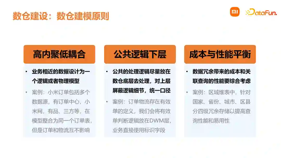 1. 高内聚低耦合将业务相近的数据设计为一个逻辑模型或者物理模型。例如订单有很多来源,包括小米商城、小米网、有品商城以及三方数据等。在 DW 层会整合为同一个订单表,同时会对一些缺失字段进行默认处理,保证所有来源的数据最终在 DW 层是统一的,从而实现高内聚。订单和物流被划定为不同的主题,以减少其耦合度。 2. 公共逻辑下沉前面介绍数仓分层时,指出公共逻辑要尽量放在 DWM 层处理,对下游使用方尽量屏蔽复杂的业务逻辑,从而做到口径统一。例如在订单处理过程中,会有很多无效的订单,识别无效订单的核心逻辑在 DWM 层,这样下游业务方就可以直接使用。 3. 成本与性能平衡一定的数据冗余,虽然可能带来成本增加,但查询性能可以得到提高。例如在区域维表设计中,针对国家、省份、城市、区县,通过一个区域层级字段将其分类,虽然数据是冗余的,但用户使用起来会比较方便,并且查询更快速。