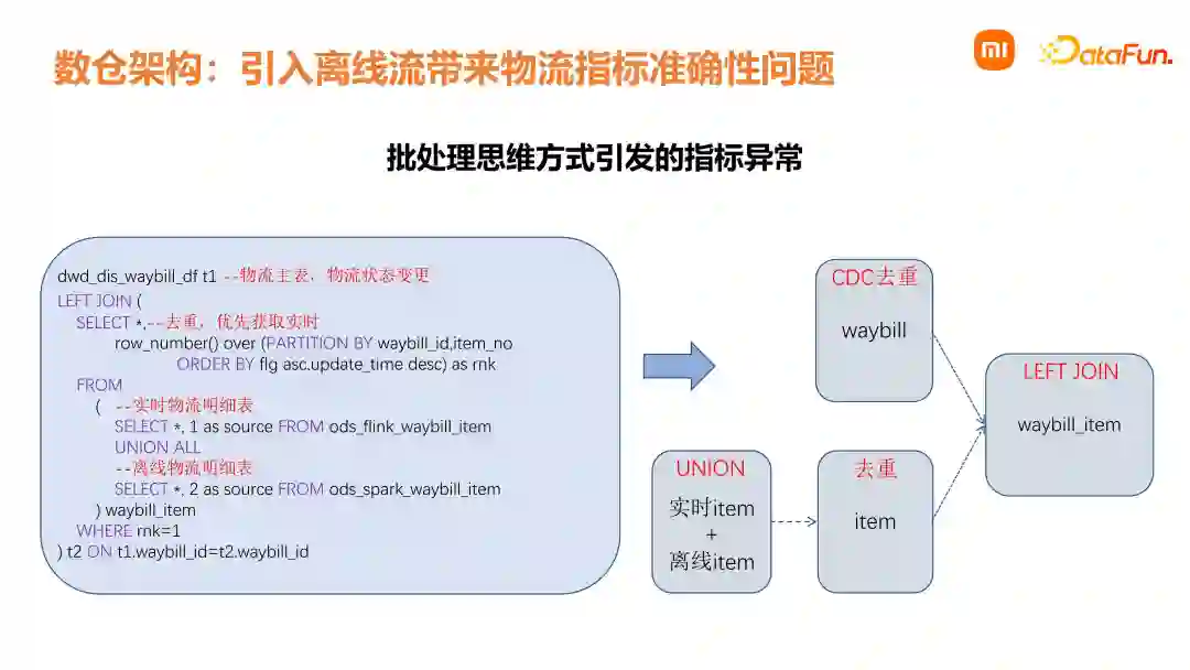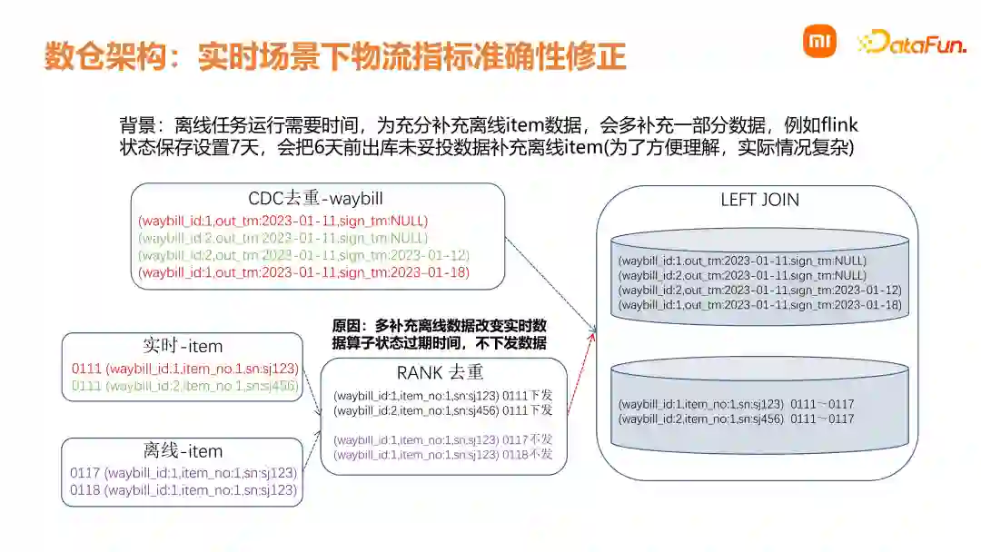 我们在处理销售实时数据中,会遇到各样的问题,这里介绍下实时数据流状态过期问题的解决方法。在实时数据中,销售订单主要分两部分。第一部分是订单事实表,第二部分是订单明细事实表。订单中所有的状态变更都体现在订单事实表,而订单明细数据在第一次创建之后,就不会再发生变化。大家都知道,实时计算消息队列的保存时间是有限制的,通常会设置一个时间周期。Flink 也有计算状态的保存时间,在一定时间周期后计算状态会过期,需要注意的是,由于订单明细不再变化,如果一些订单主表的两次状态变化时间大于状态过期时间,这时候销售相关指标是失准的。实践中是通过引入一个离线流,在订单和订单明细上各自去识别这部分过期数据,通过一个离线数据的消息队列,与原始的实时数据流进行合并,去重后下发到下游进行处理,大幅度提高同类场景下数据准确性。但是这样会引发另外一个问题,即批处理思维方式带来的物流指标异常。