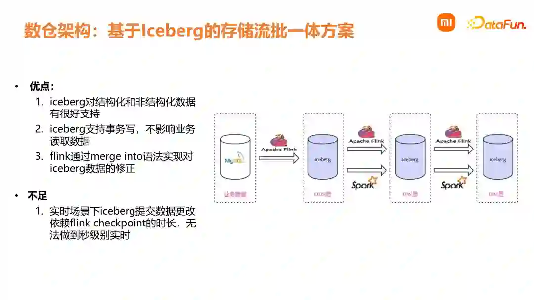 主要是将离线处理中的 Hive 和实时处理中的 Talos 全部换成 Iceberg 去处理。选择 Iceberg 的原因是其对结构化和非结构化数据都有很好的支持。小米有一些非结构化的三方数据以及一些跟谷歌合作的 BQ 埋点日志,这些数据比较复杂,把这些数据存储在 Iceberg 中会比较方便。Iceberg 支持事务写,在其变更过程中,不影响下游业务读取数据,这方面 Hive 是做不到的。另外小米计算平台团队通过 merge into 语法,实现了对 Iceberg 数据的高效修正,使得离线和实时可以高效地相互融合。但这个方案也存在不足之处,由于 Iceberg 的事务提交依赖 Commit,但是在实时写入中每次 Commit 的速度会依赖 Checkpoint 设置的时长,所以无法做到秒级别的实时。04