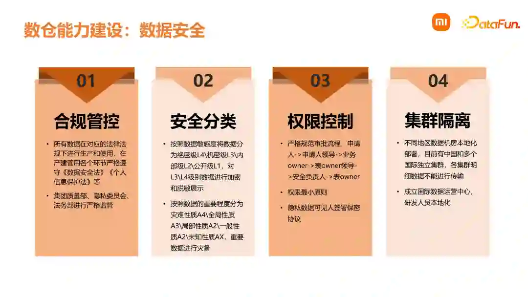 数据安全是数仓能力建设的一个重要方面。一是通过合规管控,所有的数据生产环节都严格遵守国家的法律法规。在公司内部有质量部、隐私委以及法务部会对所有环节进行监控。二是会进行安全分类,即按照数据的敏感度和重要性将数据进行分类。三是在权限控制方面,会严格规范数据流程,在每个部门都会有对应的安全负责人来负责最终的安全校验。在审批过程中,会遵循权限最小的原则。核心研发人员和使用人员,签署数据保密协议。四是集群隔离,小米是一个国际化公司。在国外会将机房部署在当地,并且机房之间的数据明细是不允许传输的。对一些汇总的指标,经过安全负责人的审批之后,可以传回国内进行分析。在欧洲的数据业务,会严格遵守欧盟的 GDPR 条例。针对海外数据,会成立国际数据运营中心,本地开发部署和运维。