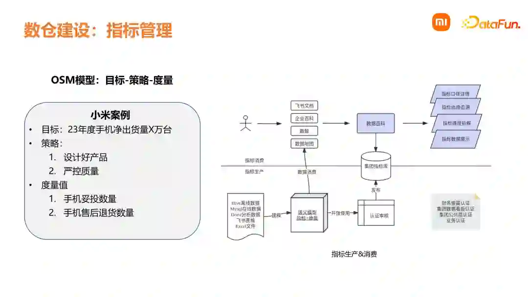 4. ****一致性在数仓建模过程中,要保证字段含义和命名规范是统一的,这样可以降低理解和使用的成本。 5. ****数据可回滚要保证数据可回滚,在不同时间去执行数仓的调度,针对历史数据计算出的结果是一致的。那我们是如何进行指标管理呢?在小米内部会通过 OSM 模型,根据公司的目标和策略,通过数仓中的度量值进行考核。 例如 2023 年的目标是手机出货量要达到 X 万台,相关策略是要设计好产品,提高用户购买;同时严控质量,减少质量问题带来的影响。基于目标和策略,在销售数仓中通过两个度量值来衡量,一是手机妥投数量,这个数值要尽可能高;二是手机售后退货数量,反馈质量情况。指标生产是基于 Hive 离线数据、MySQL 在线数据、分析数据进行建模,建立语义模型,再进行审核认证,发布到集团指标库,与数据百科进行联动。在指标消费侧,用户可以通过数据百科进行查询指标口径详情、上游血缘、维度等,数据百科与公司的 OA 工具进行联通,提高指标易用性和使用效率。03****