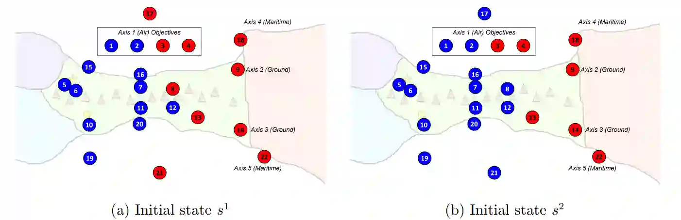 现有的战役分析方法包括兵棋推演和战斗模拟(Turnitsa 等人,2022 年)。这些工具虽然有效,但并不考虑军事战役的不确定性或行为动态,而且需要大量的时间和资源。此外,为控制军事目标而分配资源的博弈论模型并不考虑关键的战役方面,包括军事战役的动态性、顺序性、供应链要求或军事指挥结构(Washburn,2014 年)。我们希望用一种更快的技术来增强当前的方法,这种技术可以扩展到对许多输入进行评估,这就提出了我们的研究问题: 我们该如何设计动态军事行动规划,并为高层领导提供及时的评估和见解?