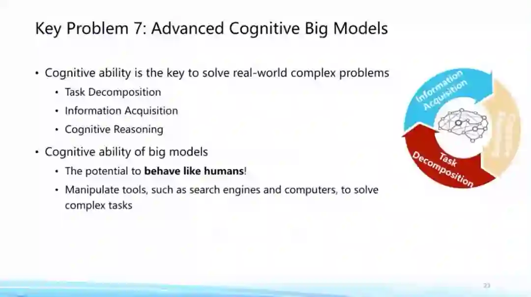 **第七个问题,人的高级认知能力是否可以让大模型学到?**能不能让大模型像人一样完成一些任务?人去完成任务一般会进行几个方面的工作:一,我们会把这项任务尝试拆分成若干个简单任务,第二,针对这些任务去做一些相关信息的获取,最后我们会进行所谓的高级推理,从而完成更加复杂的任务。
