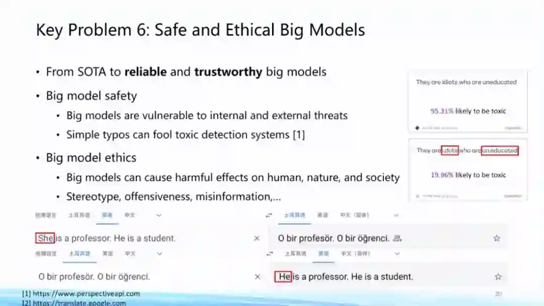 **第六个问题,现在的大模型本身在安全伦理方面考虑的比较少。**实际上会容易出现大模型被攻击的情况,可能稍微改一改输入就不work。另外,大模型的使用过程也会存在一定的伦理问题,这些问题都需要我们对大模型进行有针对性的约束。