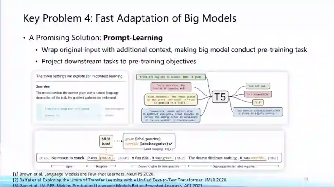 非常重要的原因就在于即使全世界已经开源了非常多的大模型,但是对于很多研究机构来讲,他们其实还是没有办法很好把大模型适配到下游任务上,这方面是大模型一个非常重要的研究前沿,一个非常重要的方向其实就是刚才唐杰老师有提到的Prompt Tuning,通过把下游任务形式更改成一个跟预训练过程中所谓masked language model相似的形式,让适配过程变得更加平滑和容易。