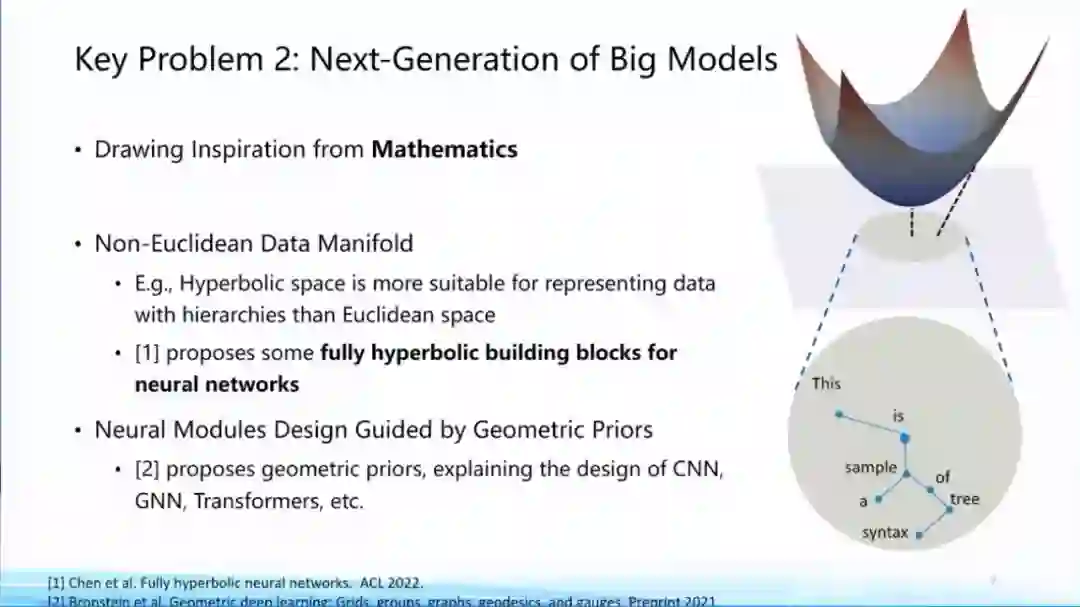 神经网络本身是受到了神经科学的启发,我们可以通过其他学科的支持去探索下一代大模型框架。其中来自数学学科的启发包括,非欧空间Manifold的框架,以及如何将一些几何先验放到模型里,这些都是最近比较新的研究方向。