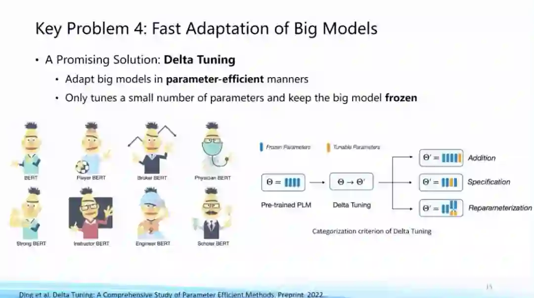 另外非常重要的一个前沿其实就是parameter-effcient learning或者Delta Tuning,基本思想就是只去调整大模型里非常小的一些参数,从而让这个模型非常快的适配到下游任务,会让适配过程不会变得那么困难,这方面是我们认为如何去把大模型快速适配到下游任务的关键问题,这是一个非常前沿的方向。刚才唐老师提到,我们其实开源了两个工具包括OpenPrompt和OpenDelta来支持这个方面的快速研究,也是欢迎大家使用、相关意见和建议甚至可以贡献。