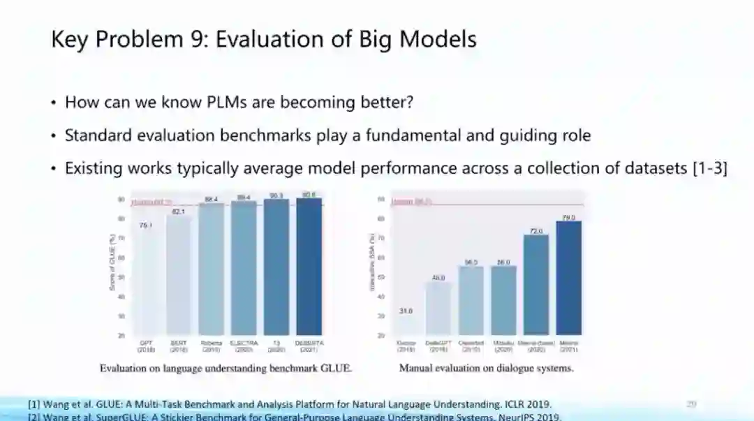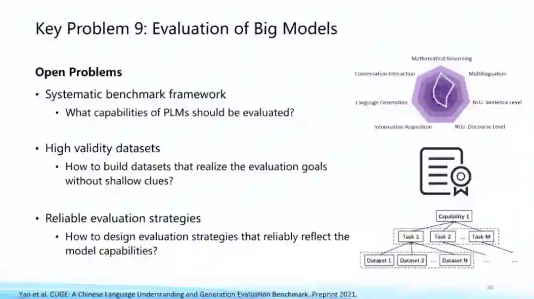 **第九个问题,大模型建得越来越大,结构种类、数据源种类、训练目标种类也越来越多,这些模型的性能提升到底有多少?**在哪些方面我们仍需努力?有关大模型性能评价的问题,我们需要一个科学的标准去判断大模型的长处和不足,在这方面智源也有相应的努力,因此我们提出了“智源指数”的概念。