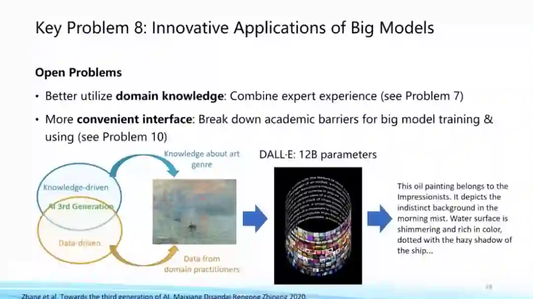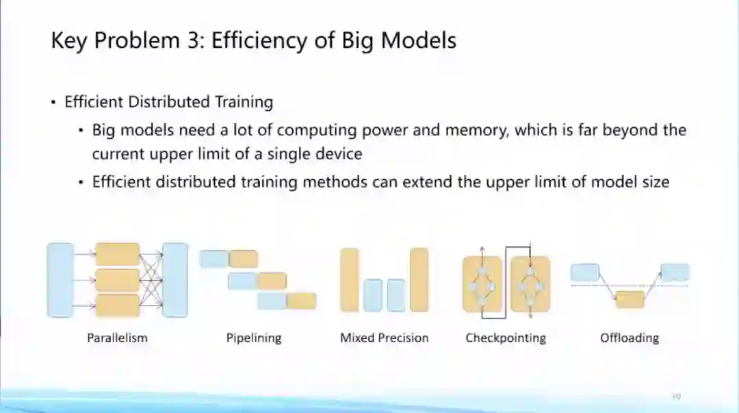 **第三个问题,大模型的性能问题。**随着大模型越变越大,对计算和存储成本的消耗自然也越来越大。最近有人提出GreenAI的概念,即需要考虑计算能耗的情况来综合设计和训练人工智能模型。面向这个问题,我们认为,随着模型变大,AI会越来越需要跟计算机系统进行结合,从而提出一个更高效面向大模型的支持体系。一方面,我们需要去建设更加高效分布式训练的算法,在这方面国内外都有非常多的相关探索,包括国际上比较有名的DeepSpeed 以及悟道团队在开发的一些加速算法。