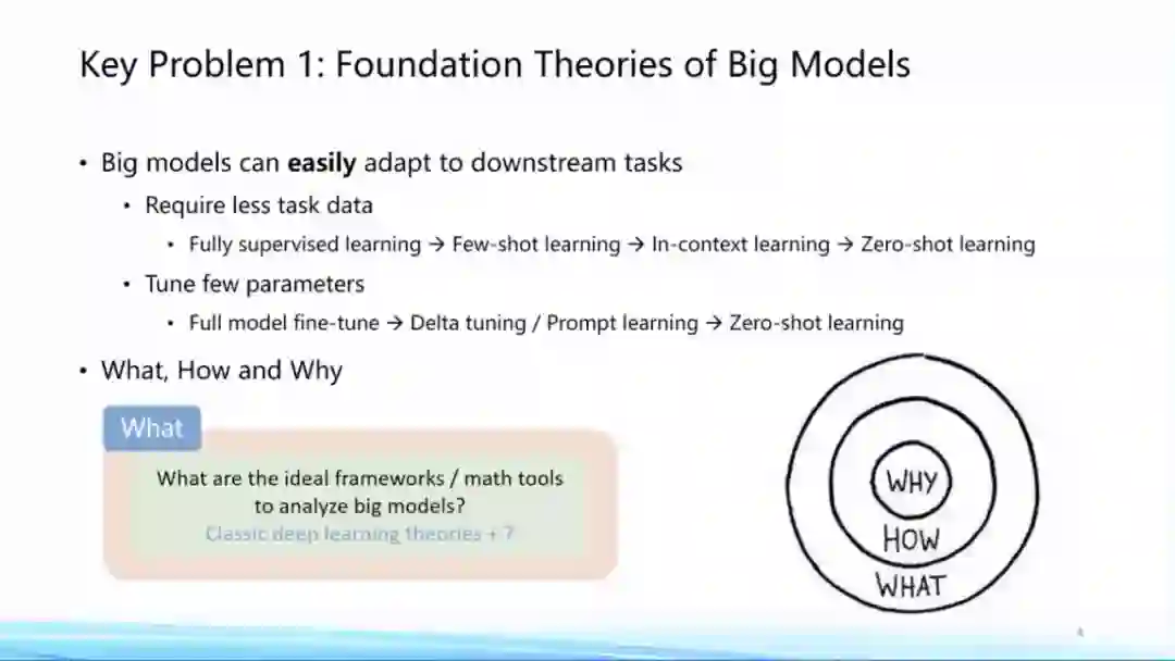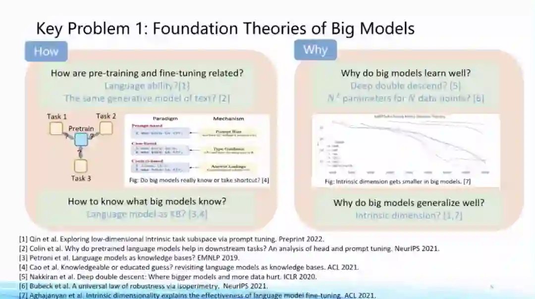 **首先,我认为在大模型当中第一个非常重要的问题就是它的基础理论问题。**大模型的一个非常重要的特点就是可以利用非常少的下游任务数据进行相关下游任务的适配,无论是全量下游任务的训练数据还是few-shot learning,甚至zero-shot learning,都能达到相当不错的效果。同时在预训练到下游任务适配过程当中,需要要调整的参数量可以非常少,这两个特点都是大模型给我们带来的新现象。