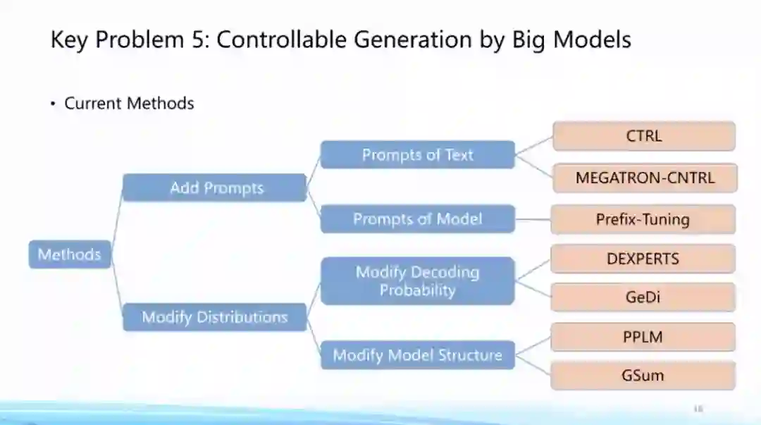 **第五个问题,大模型的可控生成。**目前大模型已经可以生成一些新的文本或图像,但如何精确地将我们想要的条件或者约束加入到生成过程中,这是大模型非常重要的研究方向。