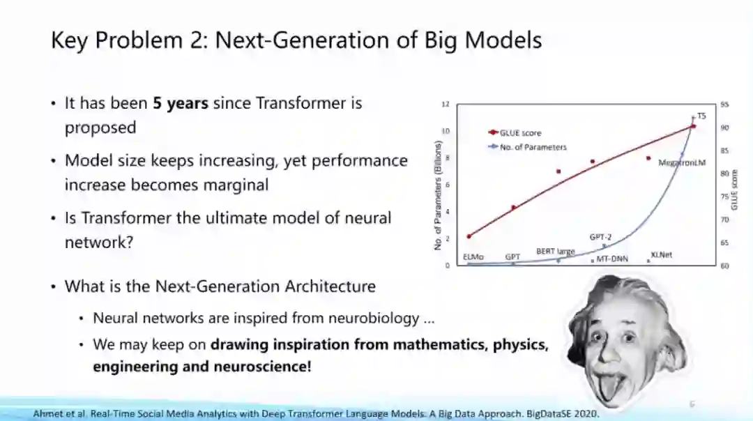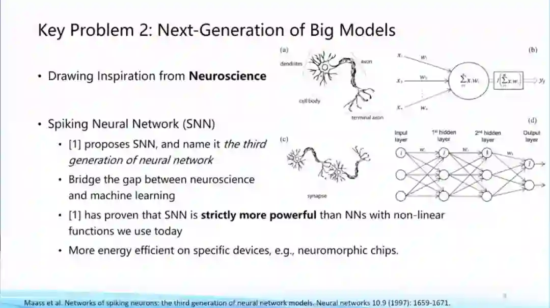 我们还可以从工程和物理角度去考虑这个问题,比如State Space Model,以及动态系统的角度去考虑等等;第三个方面来自于神经科学,面向类脑最近一直有人在研究Spiking Neural Network,上述这些都是新型架构的前沿研究。到底下一代大模型框架是什么?还没有一个标准答案,这本身就是一个亟待探索的问题。