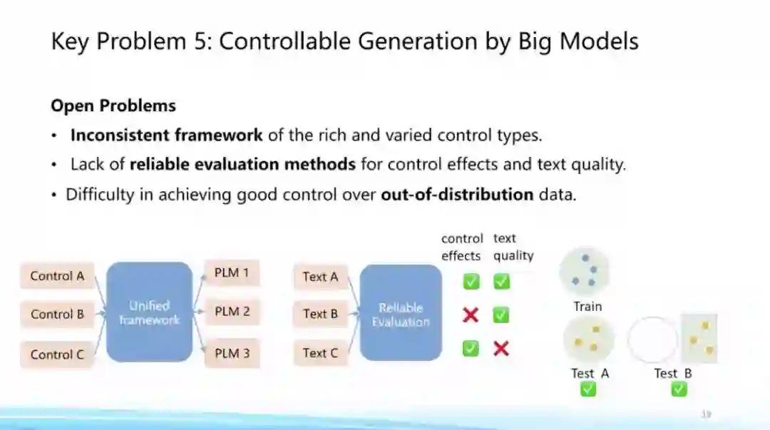 这方面也有一些开放性问题,比如如何建立一个统一的可控生成框架,如何实现比较好的评测方法,对生成的文本进行概念性甚至事实性的自洽检测,以及如何针对新的数据进行相关的生成。