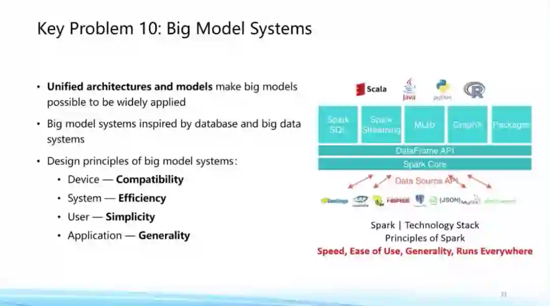 最后,我们认为大模型已经在统一框架和统一模型支持下展现出非常强大的实力,未来有希望广泛应用在各种各样的场景中。**而为了更广泛的应用,需要解决的问题是如何降低它的使用门槛。**在这方面,我们应该受到历史上数据库系统以及大数据分析系统的启发,需要构建大模型的系统,并在底层相关计算设备、系统的支持、用户接口以及应用普世性等方面进行统一的考量。